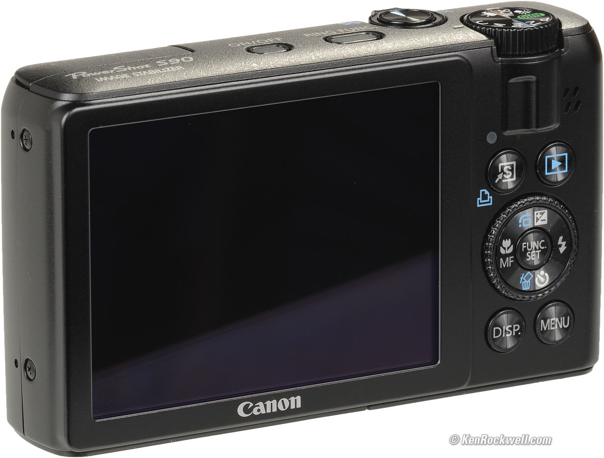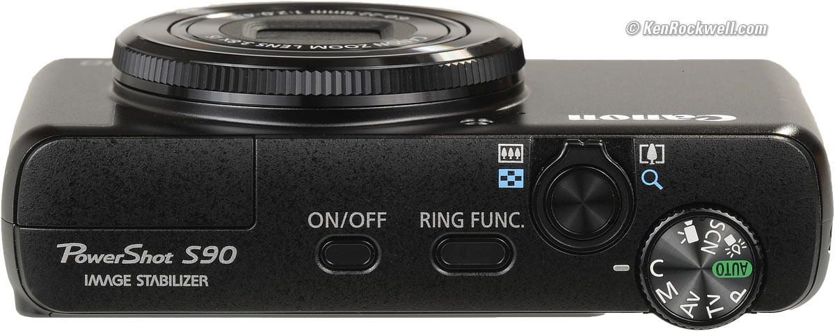 Home Donate New Search Gallery How-To Books Links Workshops About Contact Canon S90 Intro Specs Performance Compared Usage Recommendations Canon S90 IS (6.9 oz./197g with batteries and card), larger than life. bigger. This one came from Adorama; I'd also get it at Amazon or Calumet. It helps me keep adding this site when you get yours from these links, thanks! Ken. See the big ring around the base of the lens? It's a rotating, programmable control ring you dedicate to direct control of aperture, exposure compensation, or almost anything! The S90 has a built-in pop-up flash, not seen in this shot since it's retracted.