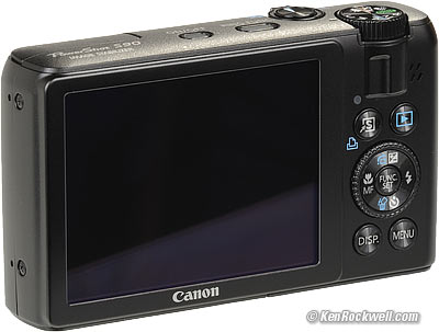 Other great S90 features are: 1.) A third dedicated mode dial on top, complete with a "C" (dedicated, saved camera setup) position. 2.) Also shoots raw, not that I care. 3.) 28mm - 105mm equivalent zoom. (3.8x ratio.) Rear, Canon S90, larger than life. enlarge. 4.) Big 3" full-height LCD (3:4 aspect ratio), not the crummy sliced-off ones becoming popular on compact cameras. Your images will fill the screen, not just the center as they do on other cameras with "chopped" (16:9) LCDs missing their tops and bottoms. 5.) Canon's good, traditional two-dimensional user interface when you hit the FUNC button. Some newer Canons use an inferior one-dimensional interface that requires a lot more button pushes to set everything. 6.) I'm jumping up and down with excitement over having two real control rings and a third mode dial on top. If this isn't enough, there is a programmable [ S ] button on the back, too.