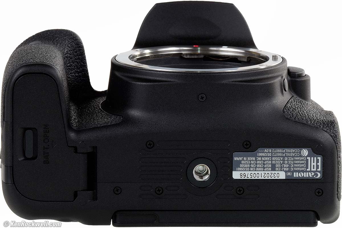 Missing● No C modes on dial; have to set and reset everything manually as you change shooting conditions — but people who get this camera rarely know how to set all that anyway. ● Has Auto ISO, but no way to adjust the slowest shutter speed; always bases it on focal length. ● Only one card slot. ● No GPS (use the GP-E2 GPS). ● No battery percentage indication, just a three-segment icon. ● No LCD auto brightness control. ● No AF Fine Tuning. ● No rear control dial (present in 77D). ● No Bulb Timer (present in 77D). ● No lock on mode dial (present in 77D). ● No top LCD (present in 77D), but who needs a top LCD when there's a bigger, better one on the back? Canon T7i. bigger.