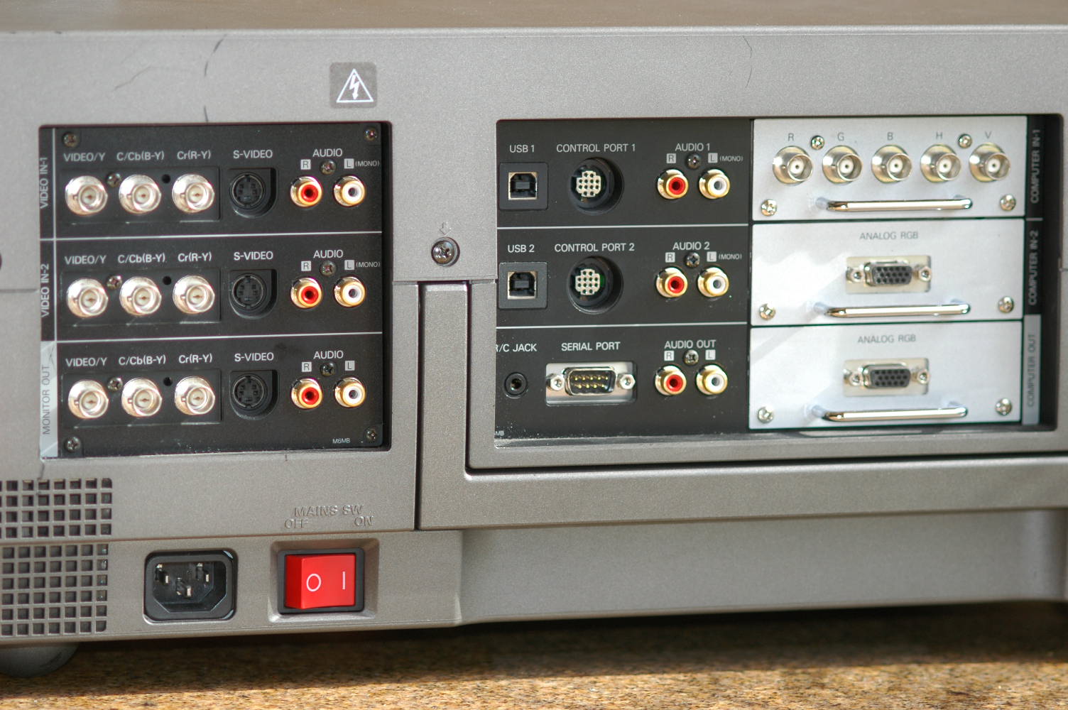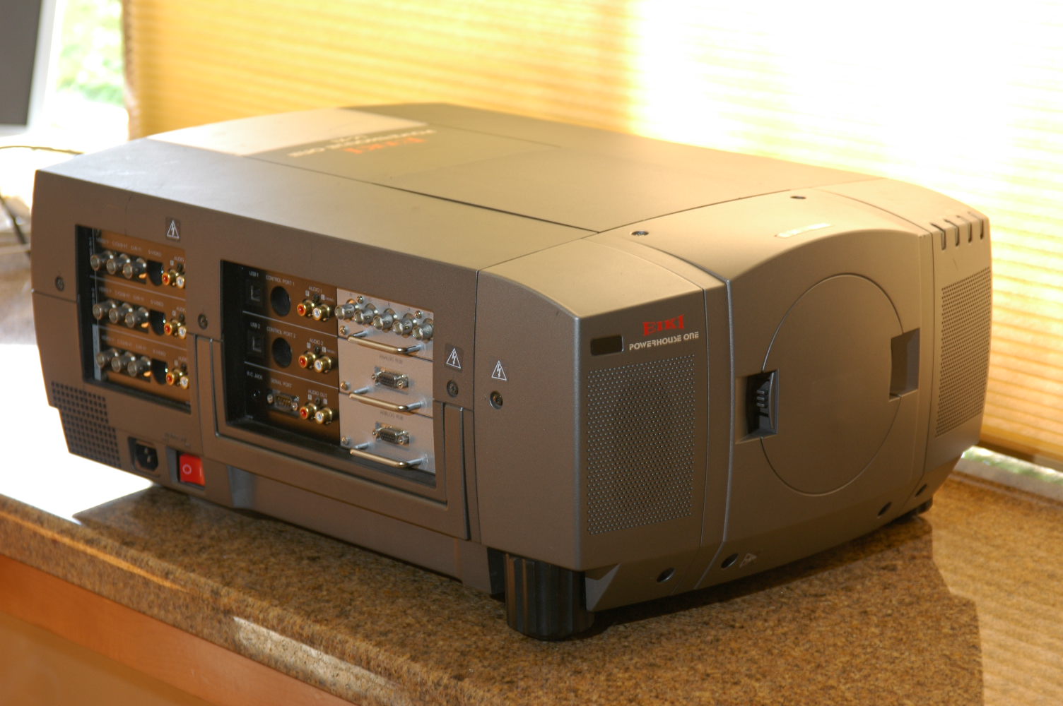LC-X1UA Powerhouse One Professional Data Projector: Click for huge image INTRODUCTION This is a huge, 40 pound professional projector intended for business, venue and theatrical use. It's MSRP was $15,995 and shouldn't be confused with the ordinary projectors you can get at Costco, camera and office supply stores. It is not a laptop-sized projector, although of course it works great for projecting from laptop computers. It projects every computer, video, TV and component DVD format I can think of. This is a workhorse of the professional audio visual and presentation industry. It rents for $500 a day here. This is because it has just about every computer and video input and output option available. It has two video input cards, two computer input cars, a video monitor output cared and a computer monitor output card as you can see here: click for huge image It could work fine in your home or photo club for computer, digital photography, video, TV and DVD projection, just that it's too big to want to carry without professional roadie help, has a loud fan and is probably too bright for screens less than 10 feet wide. You can download the manual here. Want to see how big it is? Here's my 12" laptop sitting on it: