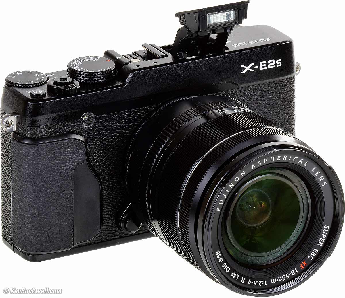 Built-in Flash Fujifilm X-E2s with and XF 18-55mm f/2.8-4 and built-in flash popped-up. enlarge. The pop-up flash is cute, but feels as if it will break quickly. It springs up instantly when you press the Bolt button, and snaps back down when you press it back into the camera. Sadly, the slow sync speed (1/140 max in actual shooting) prevents the tiny flash from being useful in daylight for flash fill. Indoors, it usually exposes quite well. It's too weak to be likely to be useful, but you can push and hold its springed cantilever a bit to bounce it vertically. All in all, the built-in flash isn't as good as the X100T, whose leaf shutter allows its tiny flash to do much more, but it does expose better than most DSLRs for indoor fill.