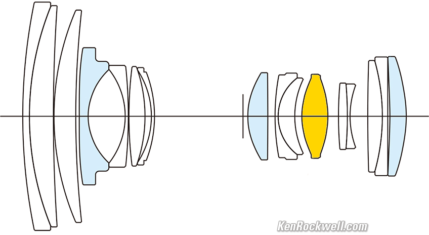 16 elements in 12 groups. One Aspherical ED extra-low dispersion element, which helps reduce secondary axial chromatic aberration. Three aspherical elements. Super Electron-Beam (multi) Coating (EBC).