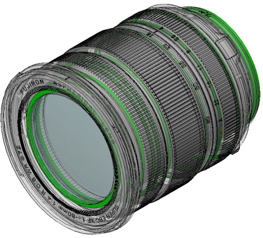 MarkingsEngraved and filled with paint on lens front ID ring, zoom and aperture rings. Painted on plastic rear-most barrel.