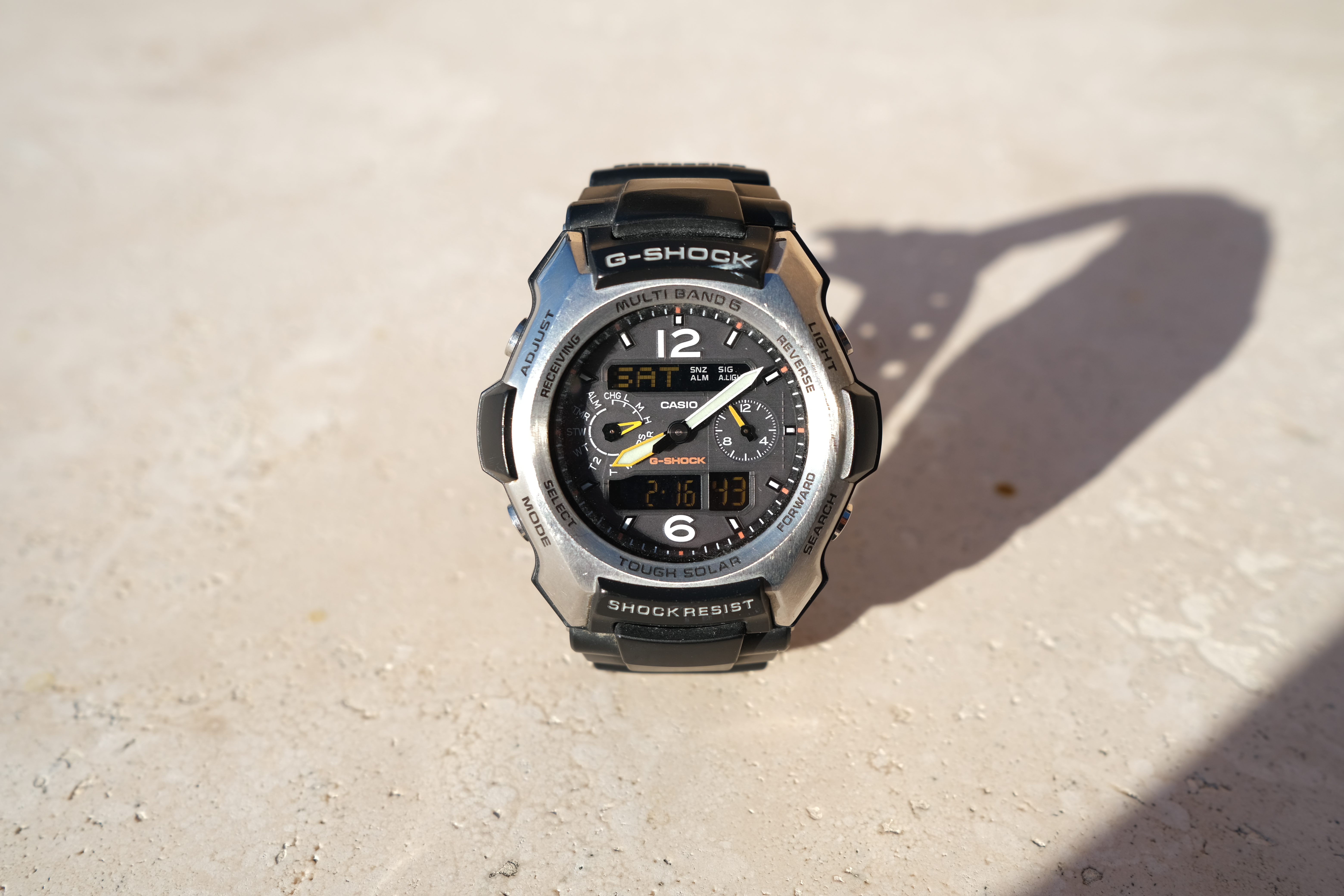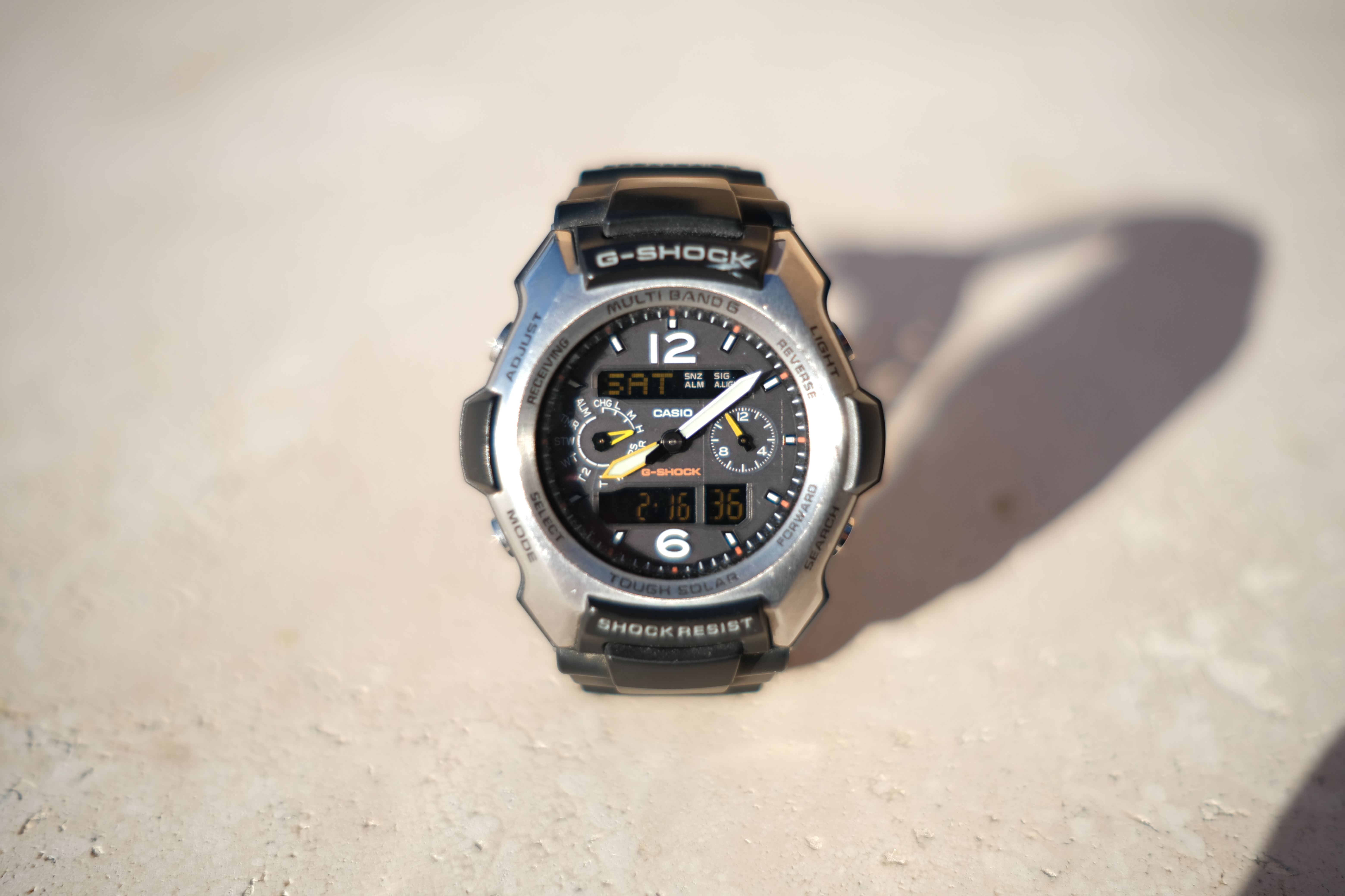 Macro PerformanceThis 23/2 focuses reasonably close, but it's not sharp if shot wide-open at close distances. It's sharp at f/5.6: Casio G-Shock Solar Atomic Watch photographed at f/5.6 at close-focus distance, 16 February 2019. bigger or camera-original © file.