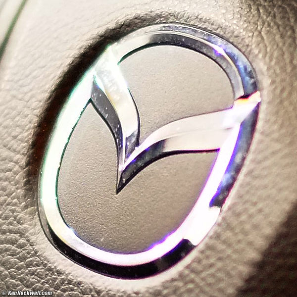 Crop from above image at 100%: note green and magenta color fringes. Note how the X-Pro1's autofocus so perfectly nailed the center of my Mazda 6's emblem.