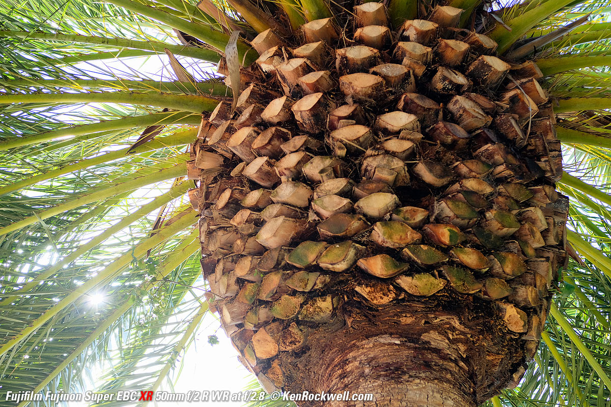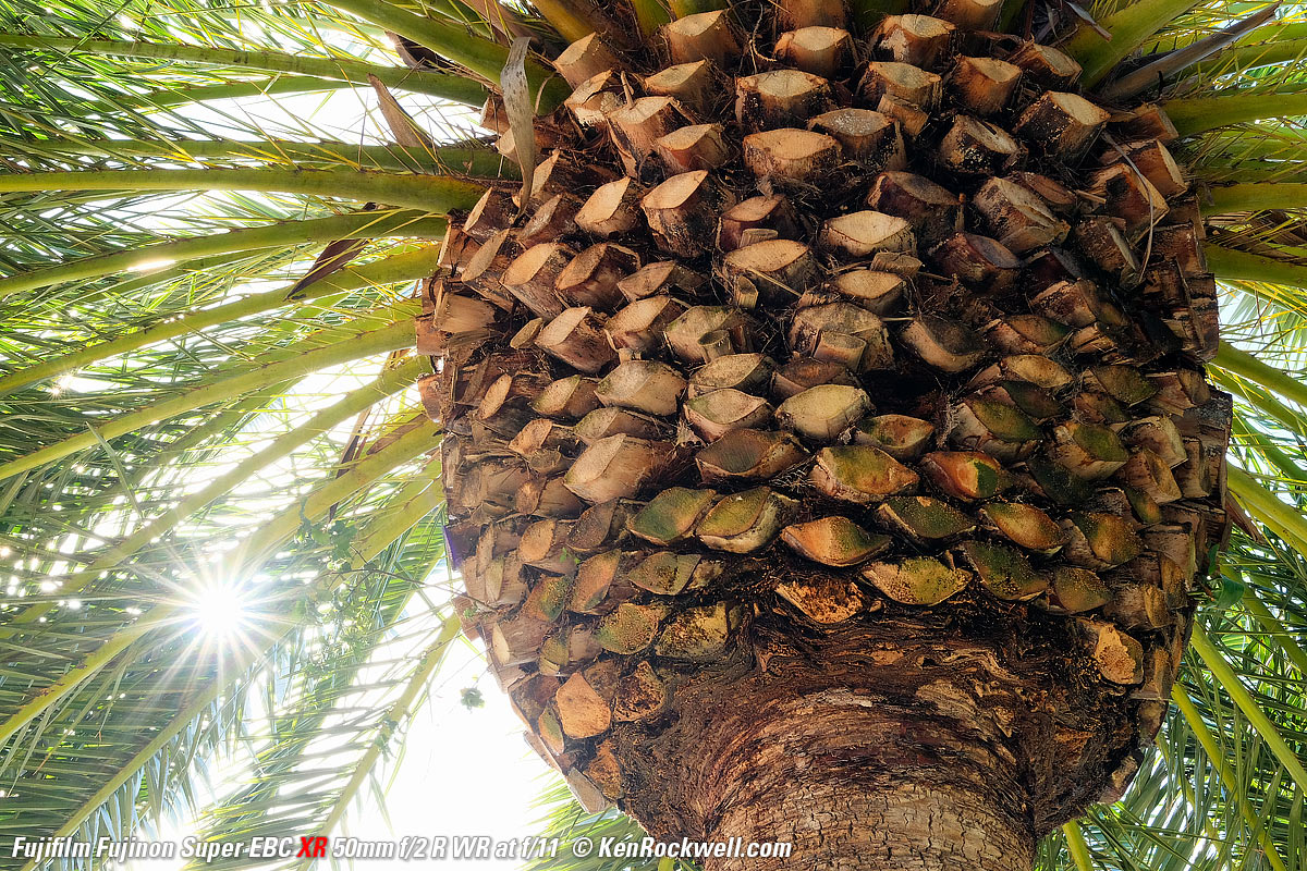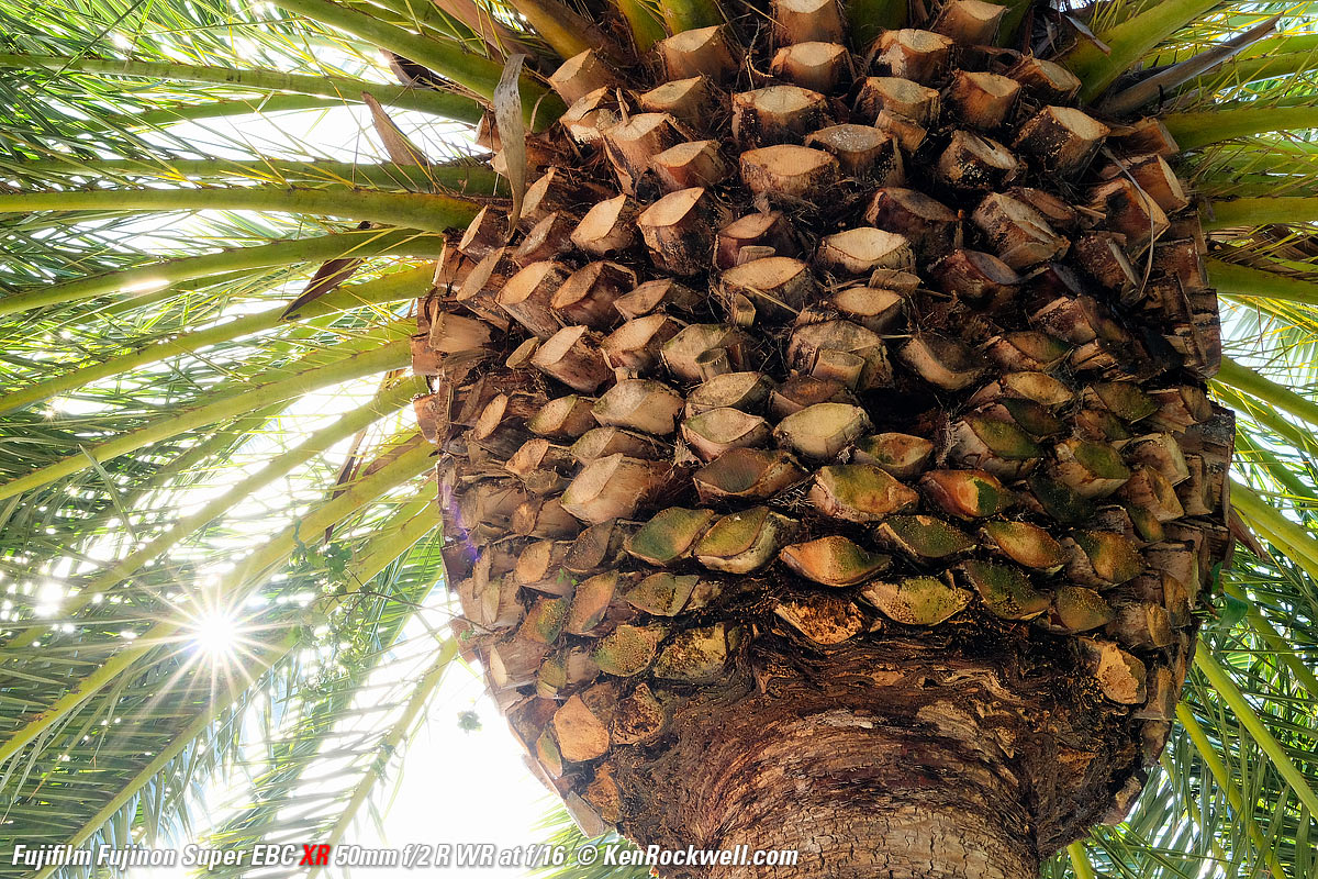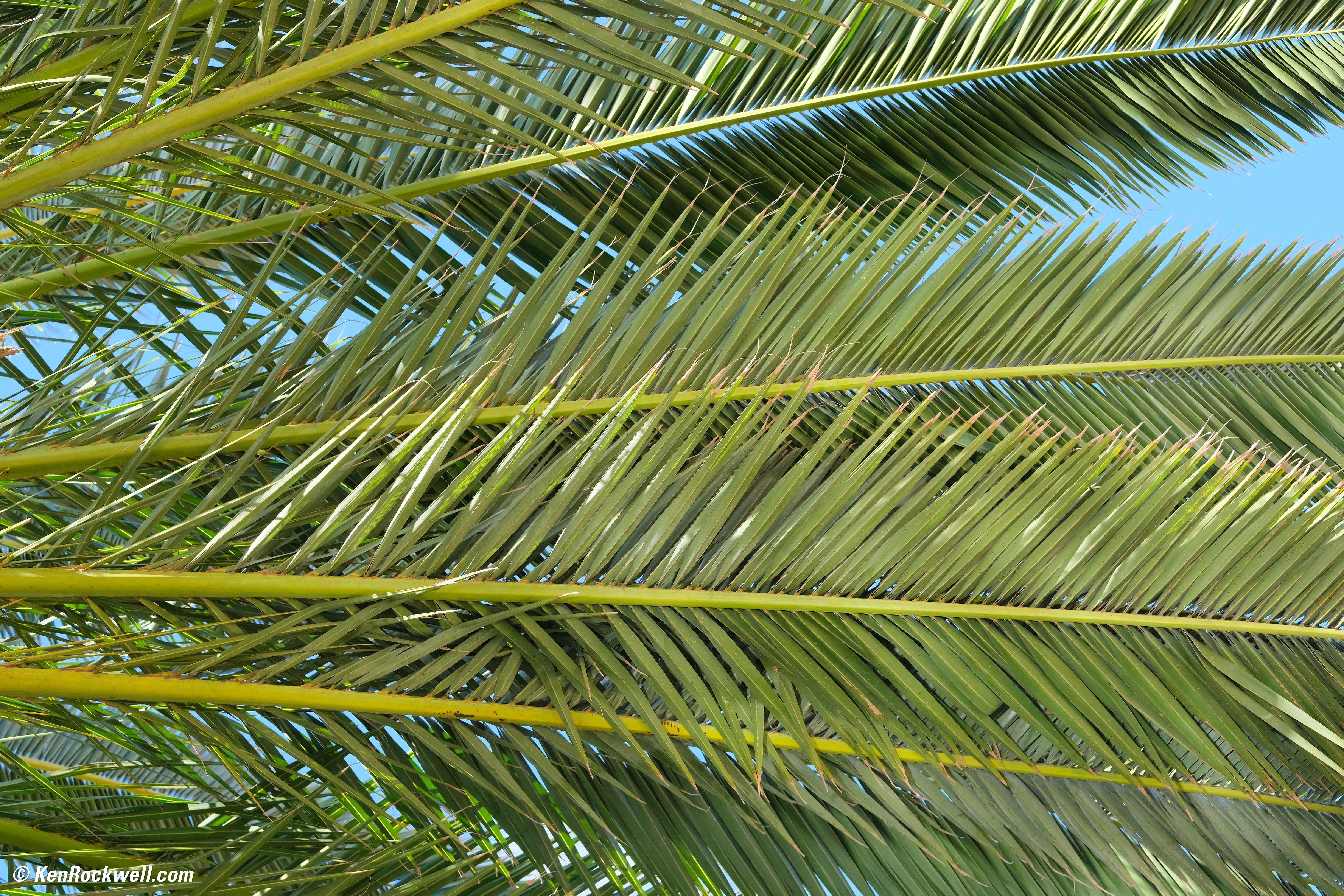 Palm Fronds lit by Dancing off the Water, 16 February 2019. Fujifilm X-T3, Fujinon 50mm f/2 at f/5.6 at 1/180 at Auto ISO 320, Perfectly Clear. bigger or full-resolution or camera-original © JPG file.