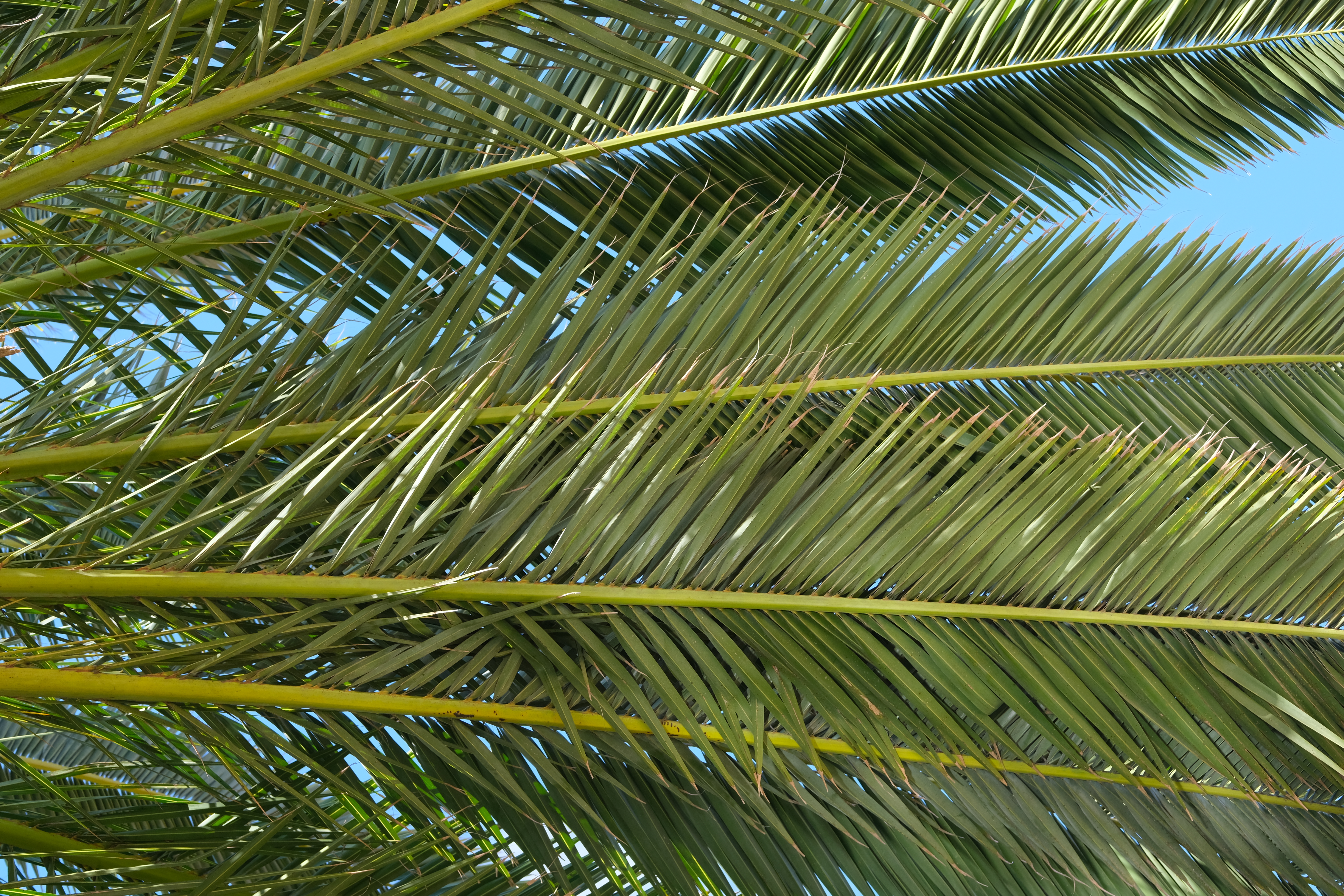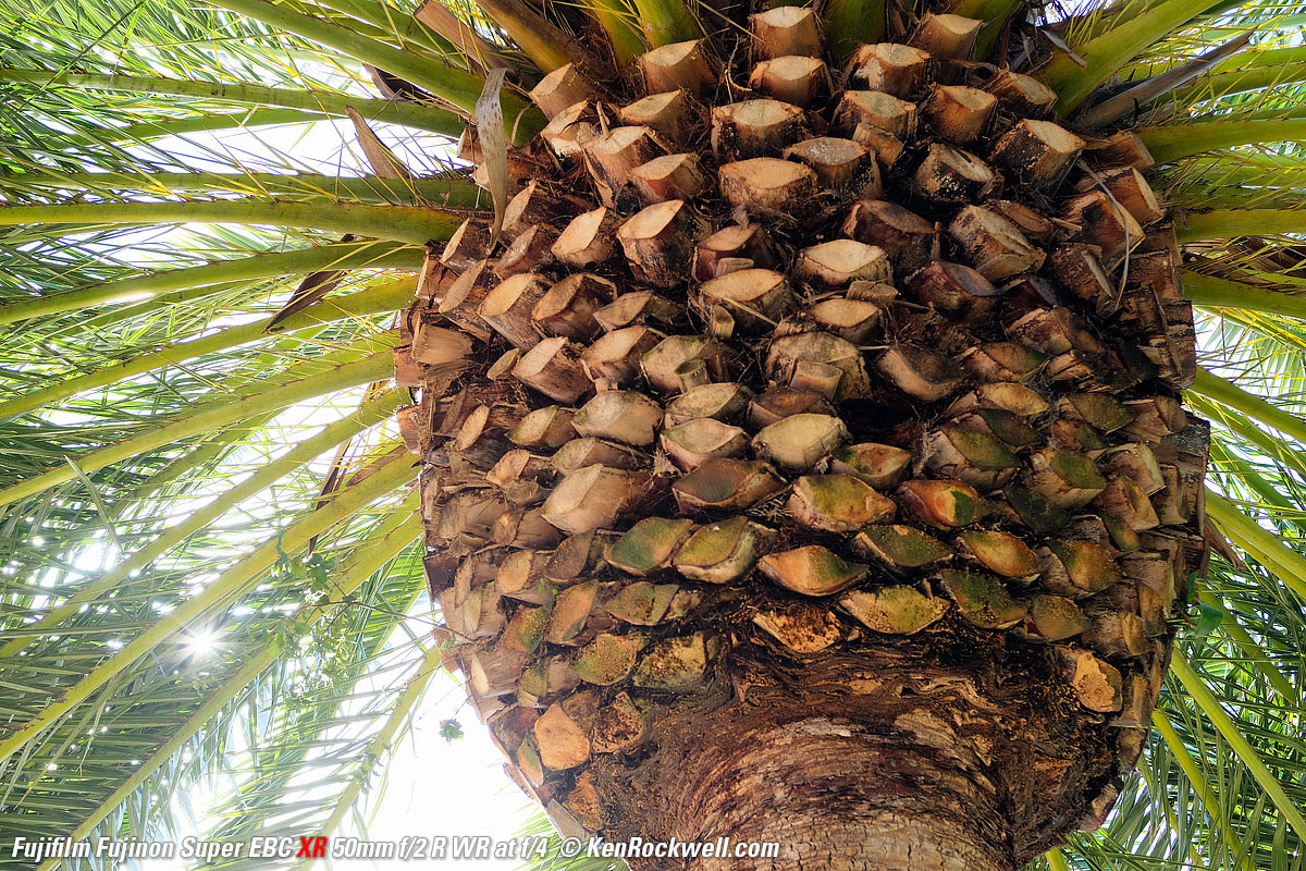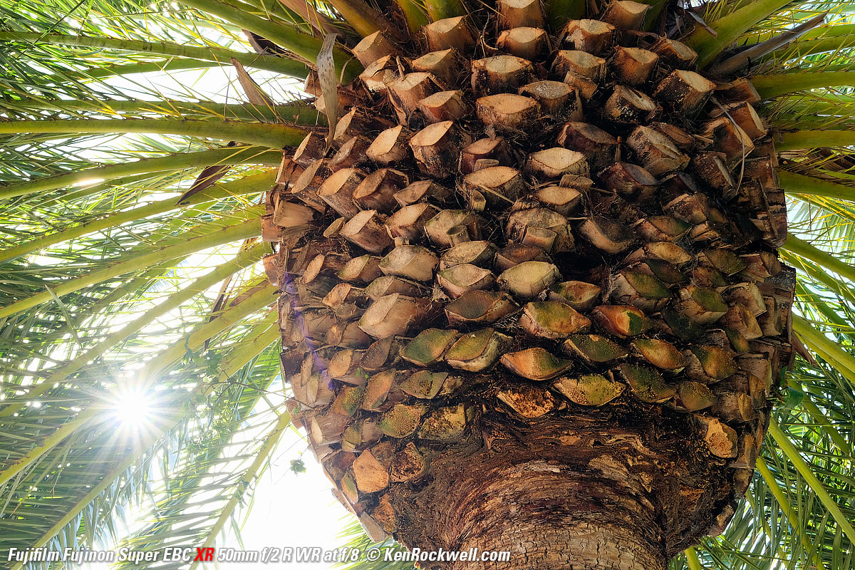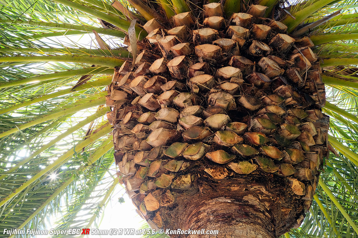 Palm Fronds lit by Dancing off the Water, 16 February 2019. Fujifilm X-T3, Fujinon 50mm f/2 at f/5.6 at 1/180 at Auto ISO 320, Perfectly Clear. bigger or full-resolution or camera-original © JPG file.