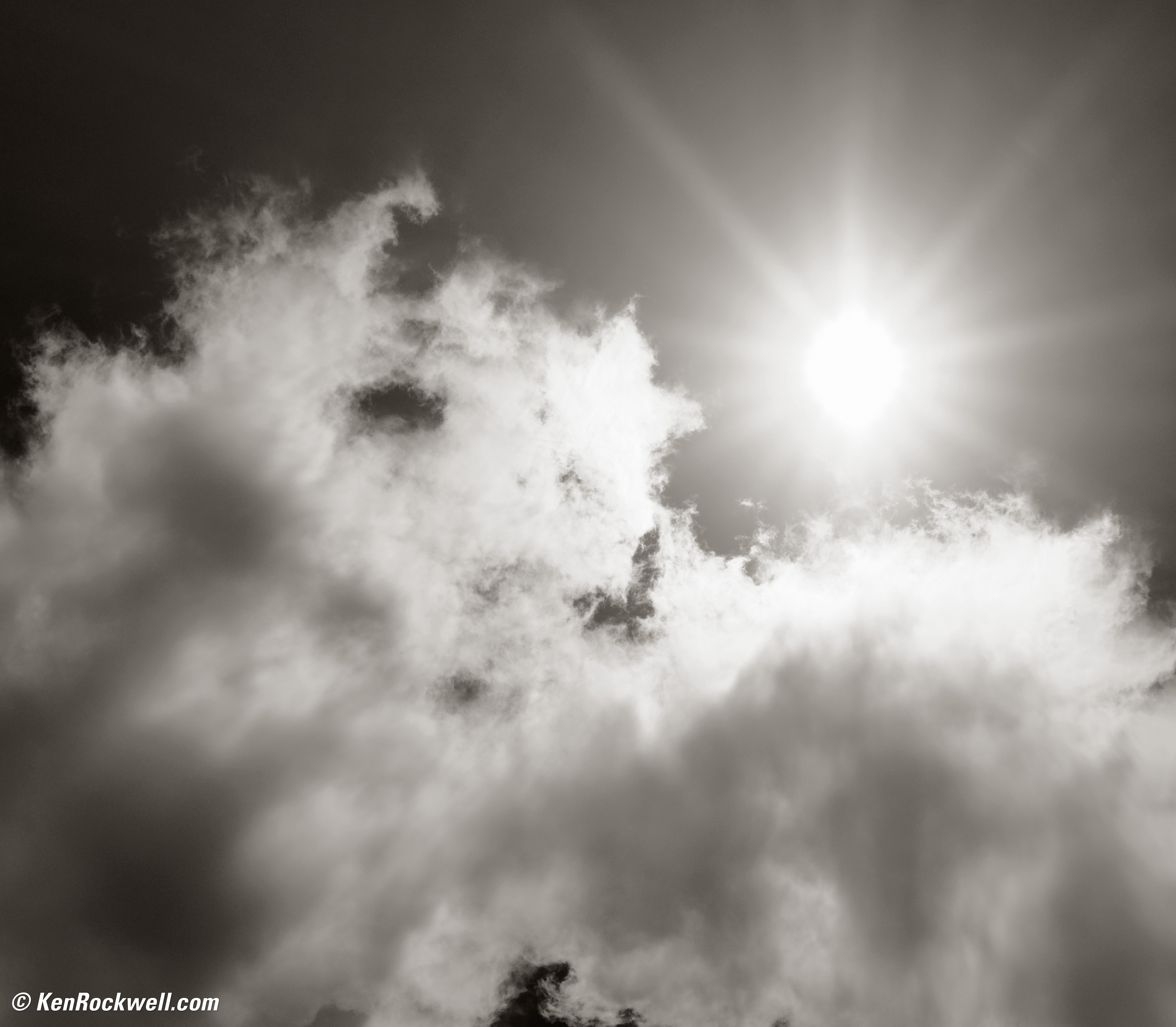 Sample ImagesTop Sample Images Introduction Specs Performance Recommendations These are all shot hand-held as NORMAL JPGs; no RAW files or FINE JPGs or tripods were used or needed. Sun and Clouds, 16 February 2019. Fujifilm X-T3, Fujinon 50mm f/2 at f/13 at 1/4,700 at Auto Dynamic Range 200% at Auto ISO 320, split-toned print. bigger or full-resolution or camera-original © JPG file.