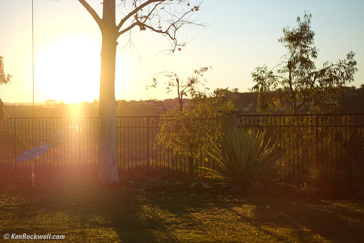 Flare and Ghosts performance top Ghost Swing at Dawn, 14 January 2015. (X-E2, standard color mode, +2 color saturation, ISO 200, XF 56mm f/1.2 APD, f/1.2 at 1/4,000.) bigger. Shooting directly into the sun, one will get a dim blob on the opposite side. Other than that, no more ghosts. See also Sunstars for more samples.