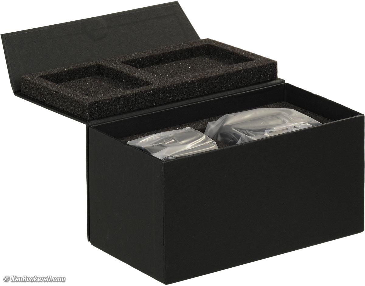 Box, Fuji XF 60mm f/2.4. Inside the box are two boxes: one large black one with the lens, and a black cardboard sleeve with the "lens wrapping cloth" and the paperwork. The lens box is marvelous: it's got a magnetic closure. Inside are custom-cut foam holding your lens, hood and all three caps.