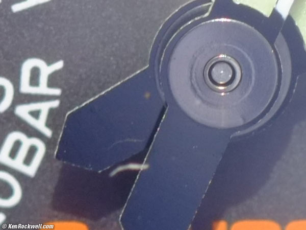 Macro performance top Rockwell's Watch at close-focus distance. f/6.4 at 1/350 on X-Pro1 at AUTO ISO 800. As with all macro shooting, there is no depth-of-field. One paper-thin plane is in focus, and that's it. In this sloppy hand-held shot of my watch, the center post is in focus, while the watch face and dust on the plastic crystal are out of focus. It's also a bit blurred from my own hand movement; this is a telephoto lens and both my camera and my watch on my other arm are moving around in the breeze, made obvious at this high magnification: