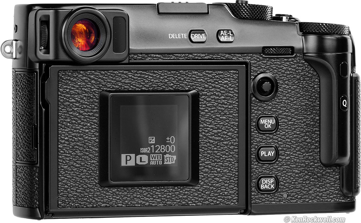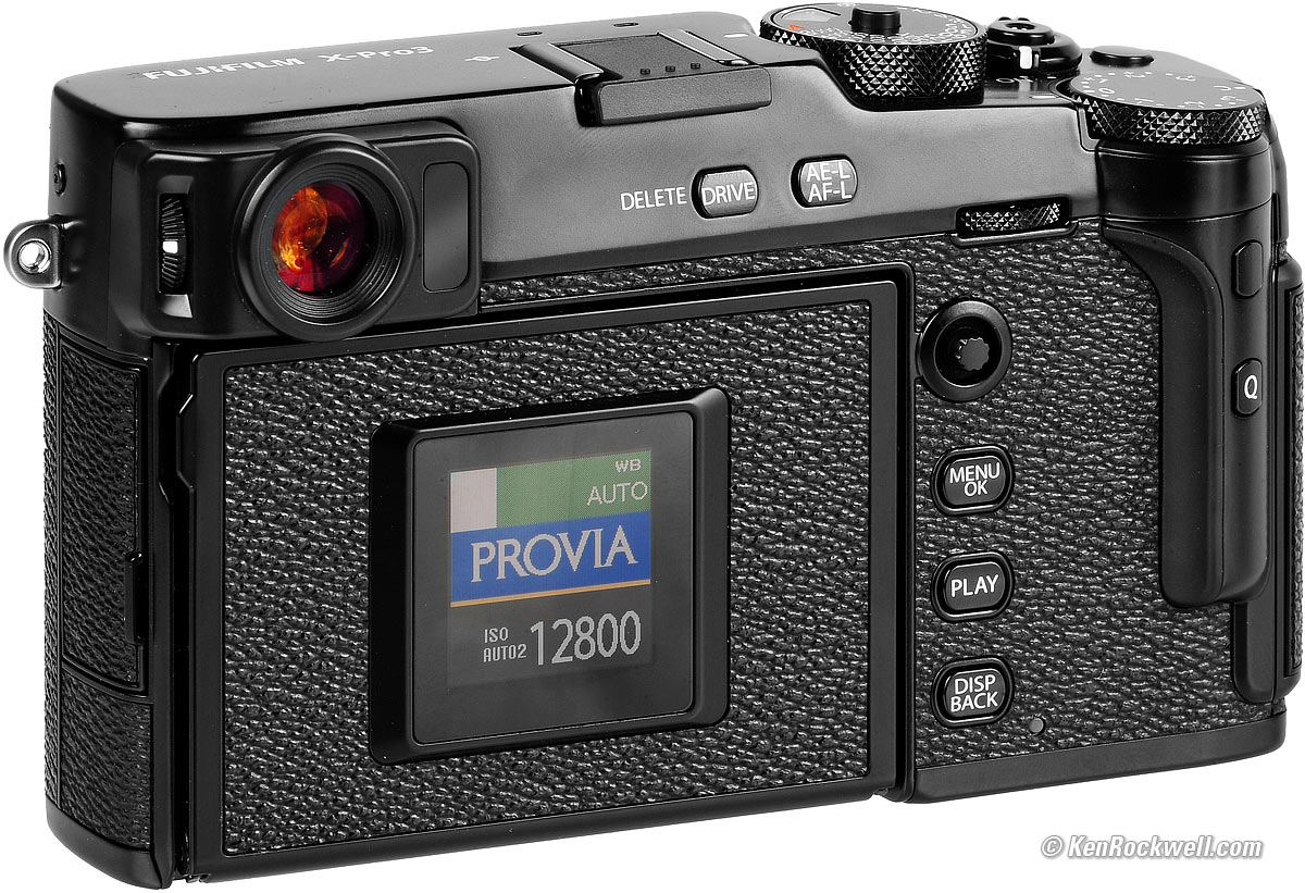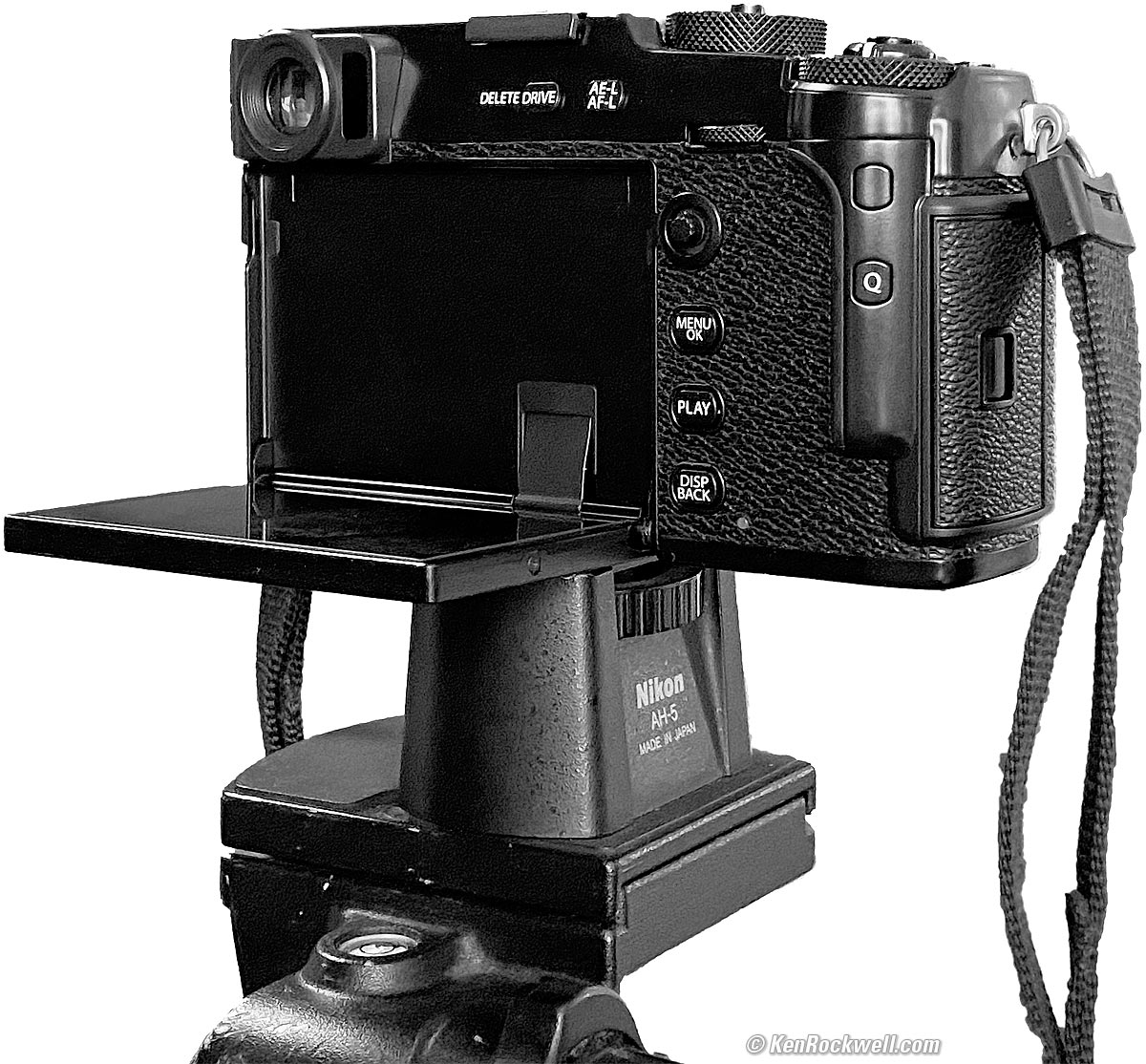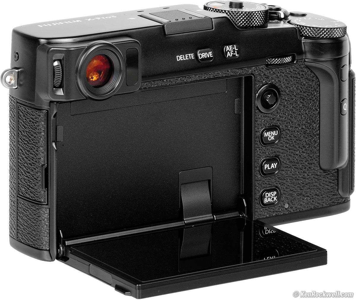 BadTo use the regular rear LCD, you have to fold it down. You can't flip it around to be visible while folded-up. Fuji X-Pro3 on a tripod. bigger. The rear LCD usually only comes halfway down when mounted on a tripod. The PLAY button is only marked PLAY; there is no universal [▶] symbol to make it easy to find. The main rear buttons are very flush, making them hard to find by feel. The ISO dial is crippled: it only sets from 160 ~ 12,800. You have to find the high and low settings elsewhere. No Advance mode dial. The menu system is atrocious (very bad!). All Fuji cameras take longer than they should to find and set menu items, and even if you find the right item, you might not recognize it or be able to find it again. For instance, Card Format is buried at MENU > Wrench > User Setting > Format, and it took me years on other Fujifilm cameras to discover that to get live color RGB histograms before you take a picture you have to do it by assigning one of the custom keys to Histogram and then press it — and no one at Fujifilm knew that (see my User's Guide). If you have the camera set in one of many ways in which flash won't fire (like Silent Shutter), the flash option simply disappears and makes you have to guess what to do to get flash going — and this goes on and on. Geesh! Once you get your menus and camera set as you want it shoots fast due to all the dials, but unless you use your camera often you'll forget where to find things. This is a frustrating camera to set up unless you're both patient and talented. Most users will never figure out how to use most of the glitzier features, and Heaven help you if you only use it once a month.
