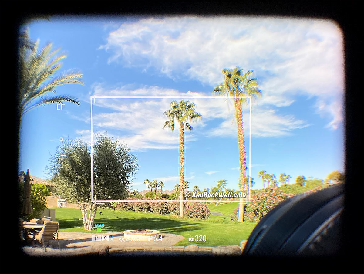 Rear Display, "Classic" mode. (also does "Standard" mode). You have to flip this down to see the real LCD. bigger. Sample ImagesTop Sample Images Introduction Specifications Accessories Unboxing Performance Compared User's Guide All shot hand-held as NORMAL JPGs; no RAW files, FINE JPGs or tripods were used or needed. Palms in Last Light, 3:48 PM, 25 November 2019. Fujifilm X-Pro3, Fujifilm XF 35mm f/2 WR at f/5.6 at 1/850 at Auto ISO 320 (LV 13.0), Auto Dynamic Range 200%, Perfectly Clear. bigger, full-resolution or camera-original © JPG file.