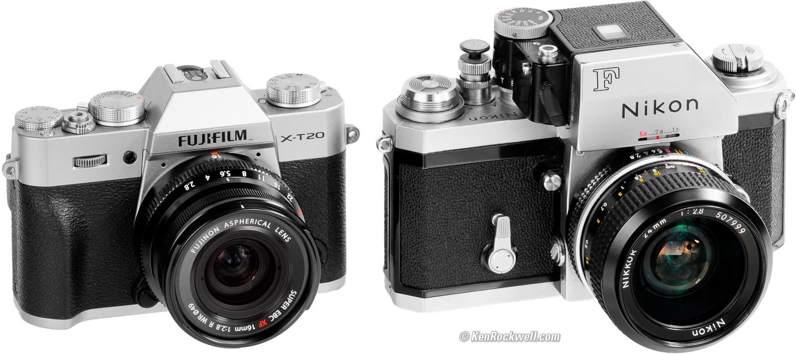 Versus Full-Frame DSLRs and 35mm SLRsIf you're an experienced photographer you'll giggle when you pick up this little Fujifilm camera. It looks like a miniature 35mm SLR, with every dimension only about 3/4 of a 35mm DSLR's: Fujifilm X-T20 w/16mm f/2.8 (24mm eq.) and Nikon FTn Photomic w/24mm f/2.8 F. bigger.