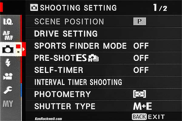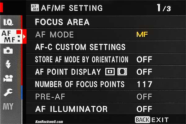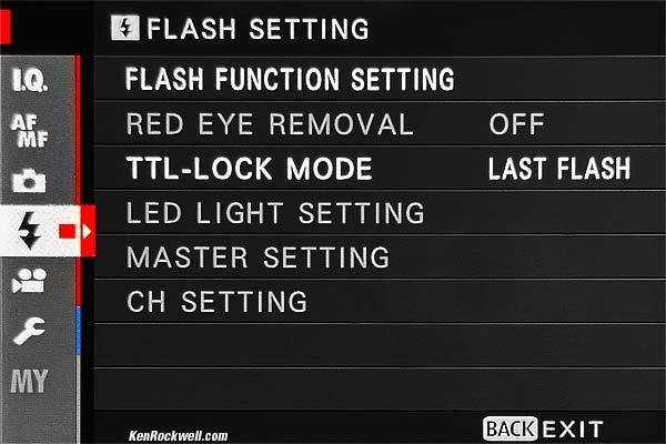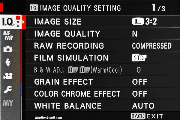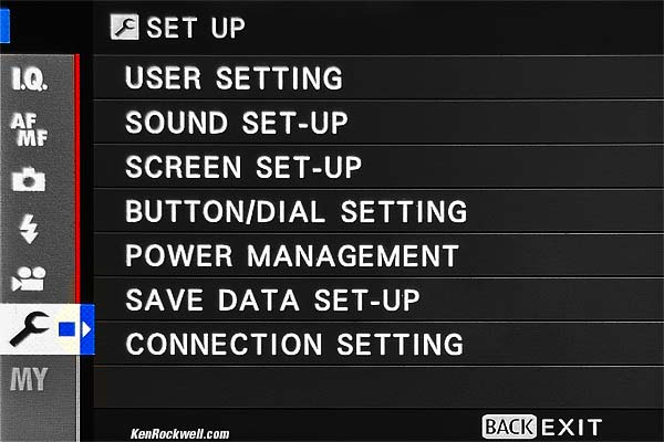 MenusThe menu system is horrible. All Fuji cameras take longer than they should to find and set menu items, and even if you find the right item, you might not recognize it. The menu system always opens at the top item, not where you last left off. For instance, Card Format is buried at MENU > Wrench > User Setting > Format, and it took me years on other Fujifilm cameras to discover that to get live color RGB histograms before you take a picture you have to do it by assigning one of the custom keys to Histogram and then press it — and no one at Fujifilm knew that (see my User's Guide). If you have the camera set in one of many ways in which flash won't fire (like Silent Shutter), the flash option simply disappears and makes you have to guess what to do to get flash going — and this goes on and on. Geesh! Fuji's menus are the worst in the industry, disorganized and with cryptic names. This is the weakest thing about Fuji's cameras. It's a bear trudging through all the menus, sorry. Everything looks the same: