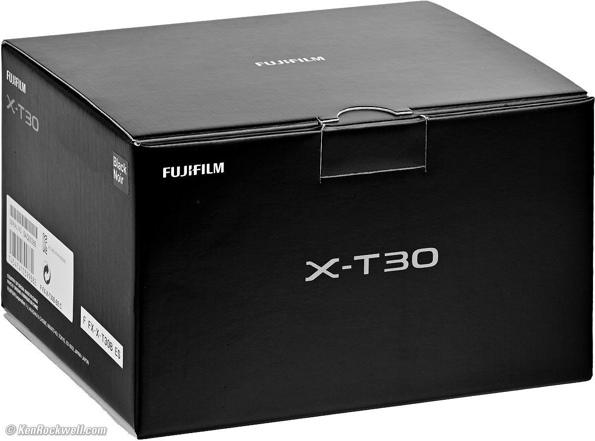 I'd get my X-T30 used at eBay (How to Win at eBay) or consider the X-T30 Mark II new at Adorama, at Amazon or at B&H. It comes in black as shown, as well as in silver and in charcoal silver. Box, Fujifilm X-T30. bigger. Fujifilm uses an unsealed microcorrugated cardboard box with formed pulp innards. The box is completely unsealed. Just like kids who lick ice cream and put it back in the store freezer or gargle with mouthwash and put it back on the store shelf, there is no way to know if anyone else has been fiddling with your camera, swapping parts and accessories, or even if it's a dropped, returned, damaged or used camera. Fuji does use a tamper sticker on the camera bag inside the box, but these are easy to put back so they don't show any tampering. This is why it's critical to buy only from an approved online source, since they ship from automated warehouses where no shifty salesmen or other customers ever getting to touch your new camera before it ships. While new $5 CDs, DVDs, Blu-Rays and bottles of milk and drinking water are sealed and quite obvious if anyone's opened them, paradoxically Fuji doesn't bother sealing its boxes, so your only insurance is to buy only from a trusted online dealer.