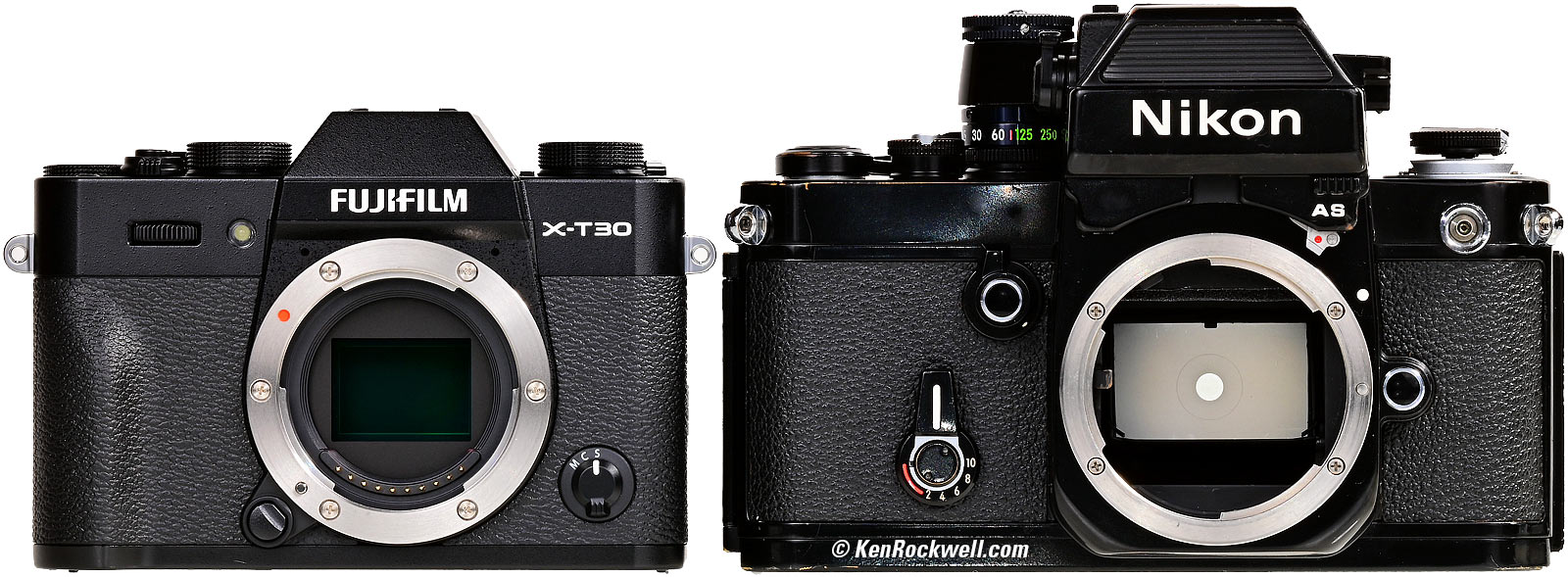 Versus Full-Frame DSLRs and 35mm SLRsIf you're an experienced photographer you'll giggle when you pick up this little Fujifilm camera. It looks like a miniature 35mm SLR, with every dimension only about 3/4 of a 35mm DSLR's: Fujifilm X-T30 and Nikon F2AS 35mm SLR. bigger.