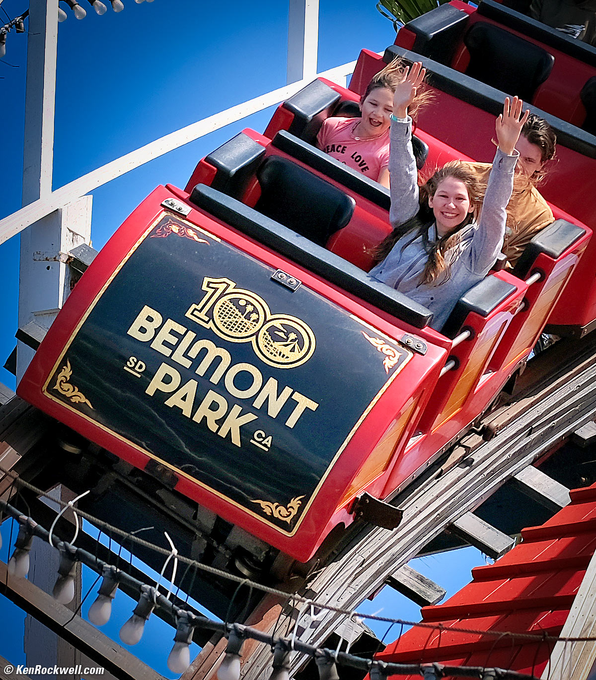 The Big Dipper, Belmont Park, Mission Beach, San Diego, California, 11:45 AM, Tuesday, 18 March 2025. Strongly cropped from Fuji X-T30 (which was in the room when it happened) and TTartisan 56mm f/1.8, f/5.6 at 1/680 at ISO 160, +0.7 stops compensation (LV 13¾), Dark faces lit with Radiant Photo software and deliberate vignetting added in Skylum Luminar Neo software. bigger. It's nice that my Fuji X-T30 and TTartisan 56mm f/1.8 have so much resolution (like every camera today) that it's trivial to crop so I don't need to carry any stinking long tele. Here's the as-shot image before cropping: Complete as-shot image from which the above was cropped and edited. bigger. Camera maker really play the FUD card trying to scare the innocent into thinking they need 45 megapixels to crop. This was shot on a 2019 camera with a $129 lens. Ha! The above is a 5× crop from APS-C, making the crop similar to a 400mm lens! Heck, if I had used a 400mm lens it's not likely it could have tracked focus, and even less likely I'd have it framed as I wanted it.