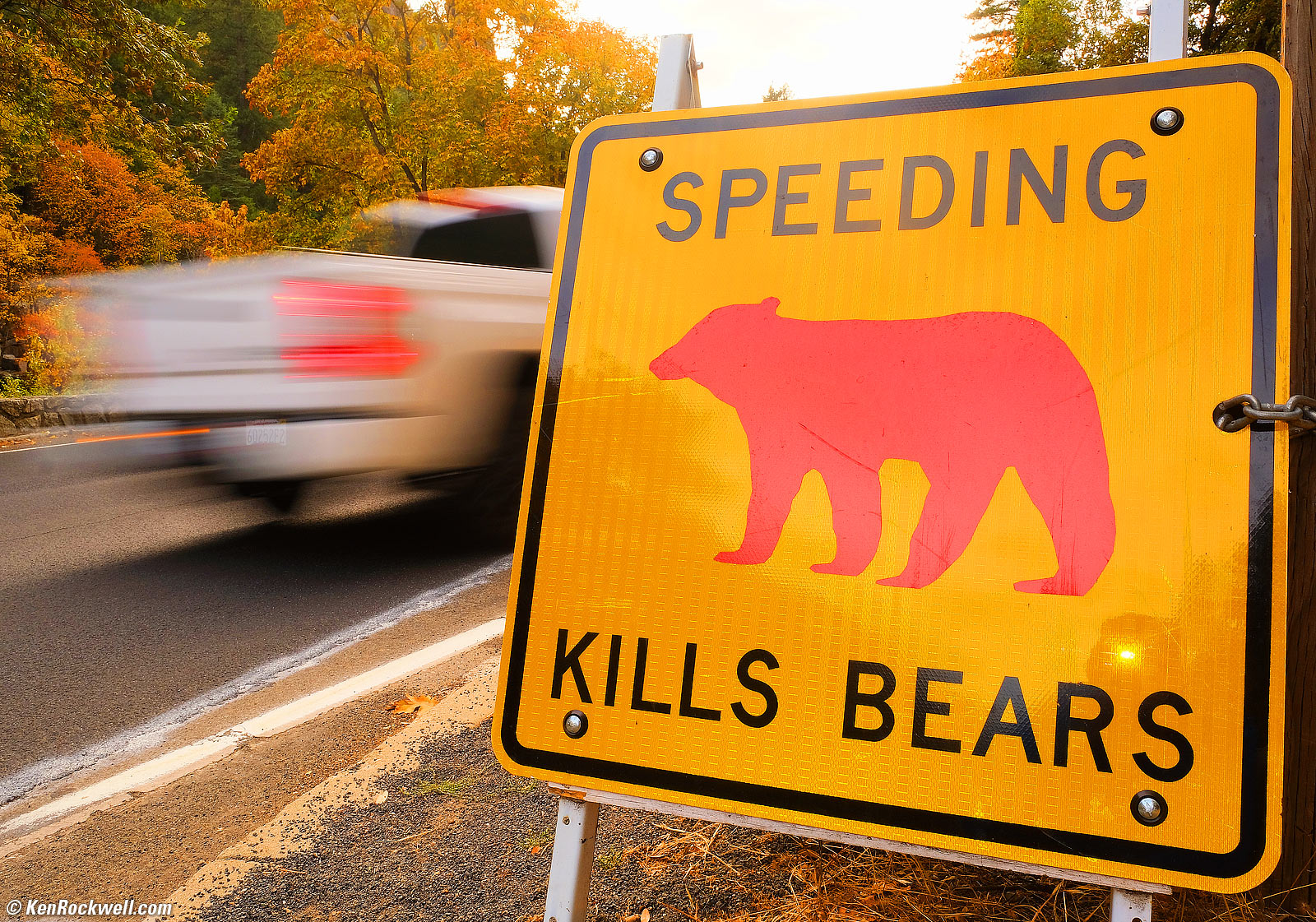 ErgonomicsSpeeding Kills Bears, Yosemite National Park, California, 4:45 P.M., 19 October 2019. Fujifilm X-T30, built-in flash ON, Fujifilm XF 18-55mm f/2.8-4 at 18mm at f/16 hand-held at 1/15 at Auto ISO 320 (LV 10.3), Auto Dynamic Range 200%. bigger. I love my X-T30: I knew that all I had to do was pop-up its built-in flash and it would light-up the retroreflective sign, and without taking my eye off the subject I could flick the shutter-speed dial (both so sorely missing on the GFX 100) down to 1/15 for great motion blur and the rest would all fall into place so I could concentrate on what was driving by.