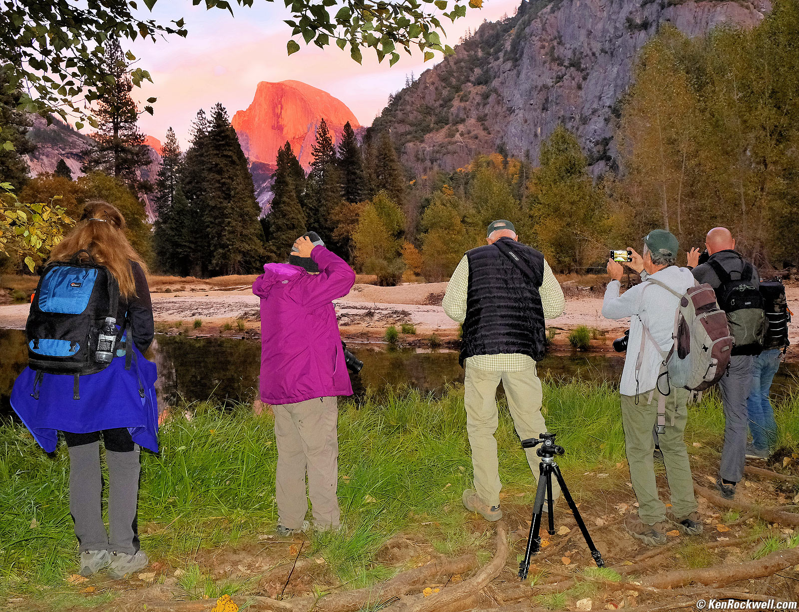 Photographing the Half Dome along the Banks of the Merced River, Yosemite Valley, Yosemite National Park, California, 6:19 P.M., 19 October 2019. Fujifilm X-T30, built-in flash ON, Fujifilm XF 18-55mm f/2.8-4 at 18mm at f/5.6 at 1/60 at Auto ISO 2,500, -2 stops exposure compensation (LV 6.4). bigger. My X-T30's built-in flash works brilliantly to illuminate the others who otherwise would have been nothing but black shadows. The -2 stops exposure compensation brought down the brightness of the Half Dome and let the flash light the foreground.