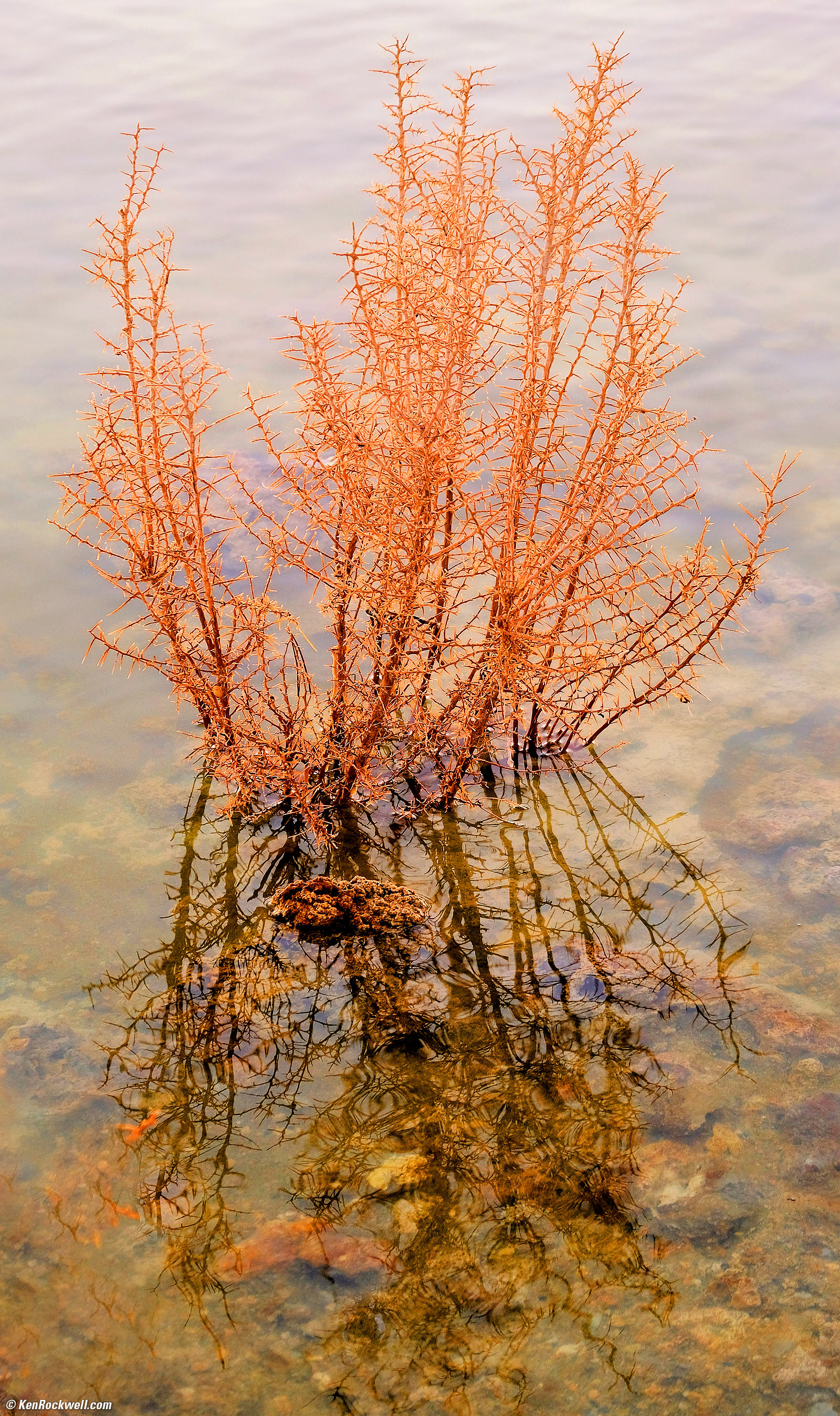 Dead Bush in the Water, Mono Lake, California, 7:17 A.M., 22 October 2019. Fujifilm X-T30, Fujifilm XF 18-55mm f/2.8-4 at 55mm at f/4 hand-held at 1/90 at Auto ISO 320 (LV 8.9), Auto Dynamic Range 200%. bigger.
