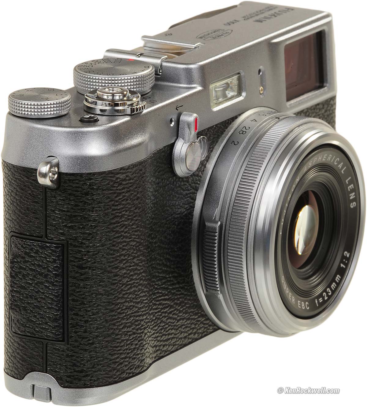 Lens performance top See also lens specifications with cutaway images. See also my Fuji X100 Sample Images page. See also How to Use Filters on the X100. Front, Fujifilm FinePix X100. bigger. A weird thing about the lens is that, for cosmetic reasons, the front element is much larger than optically useful. The extra glass beyond the entrance pupil as seen from even the most oblique angle is there to make the X100 look more like a real camera with a 35mm sensor and its larger lens. The lens is magnificent. It's fast and sharp and has very little distortion. Is it just coincidence that the human eye has the same 23mm focal length? In fact, this FUJINON 23mm f/2 ASPH has only half the distortion of the LEICA SUMMICRON-M 35mm f/2 ASPH, which is LEICA's equivalent on the LEICA M9! For critical use, use a value of -0.7 in Photoshop's Lens Distortion Filter to correct it, however just like the SUMMICRON-M ASPH, the distortion is complex and never completely corrects with simple tools. The 9-blade diaphragm is rounded, so sunstars are subtle at best. See example at Sample Images. Light falloff is invisible, even at f/2. I've greatly exaggerated it here by shooting a gray field and presenting it against another gray field.