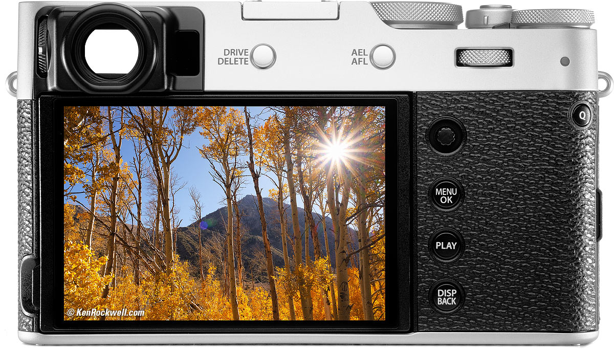 Optical and electronic viewfinders, and a rear LCD, any of which may be used for shooting and for playback.