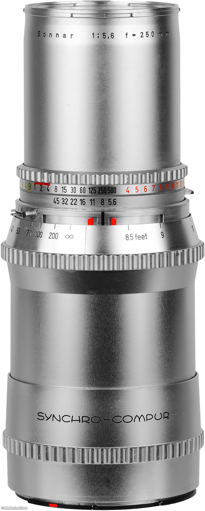 MechanicsHasselblad Zeiss Sonnar 250mm f/5.6. bigger. Lenses don't get any better than this. The Hasselblad Zeiss Sonnar 250 5.6 C shown here is solid chromed brass. See the fine milling marks on the barrels? This lens is lathe-turned brass! Newer models add more plastic and skimp by painting some markings that should be engraved.