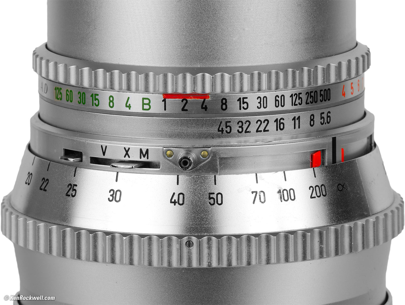 Flash & Digital Back SyncZeiss 250mm f/5.6 sync, focus and exposure controls. bigger. The V X M selector sets the flash synchronization and the self timer. To unlock the V X M selector lever, move the little lock lever (near the 25 as shown above) towards the front of the lens. X is normal, for modern studio strobes, digital backs and ordinary electronic flash. M is for M-type flashbulbs. V is the self timer. Push the lever all the way towards V, and you'll get an 8 to 10 second mechanical delay after you press the camera's shutter. The self timer always uses X sync when it fires.
