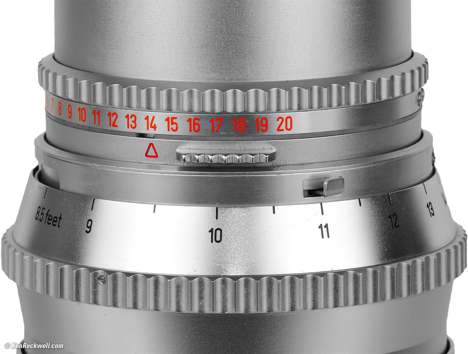 Depth of FieldTo preview the depth of field, press-in the little lever shown near the "11" above. If your lens is cocked, the diaphragm will stop down, and change as you set apertures. To reset it to stay open, either take the picture, or set the lens to f/5.6, at which the diaphragm will stay locked wide open as you set different apertures. This C version has an automatic analog computer that calculates the depth of field for a 60 micron circle of confusing. This is always displayed by the red bars next to the focus scale. Newer models economized and removed the computer; they have the usual markings. To calculate the aperture that will give optimum sharpness when you need depth-of-field and don't want diffraction to soften the image, put a new scale over the computer display and use these half distances (see here for details of how to use these): Focal length = 248.4 mm (actual design value)