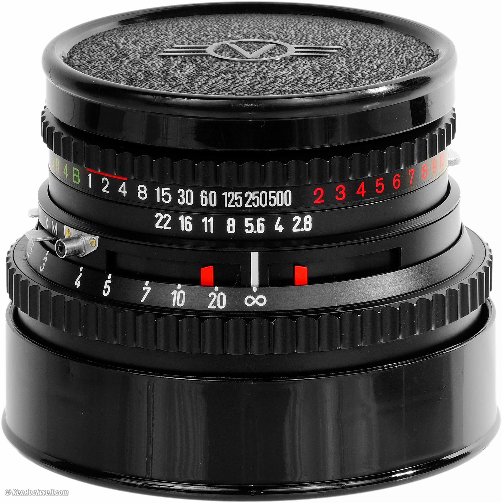 Self Timer, Flash & Digital Back Sync user's guide topZEISS PLANAR T✻ 80mm f/2.8 Flash Sync & Self-Timer Controls. bigger. The V X M selector sets the flash synchronization and the self timer. To unlock the V X M selector lever, move the little lock lever (left of the V) towards the front of the lens. X is normal, for modern studio strobes, digital backs and ordinary electronic flash. M is for M-type flashbulbs. You guys have no idea how tough it was in the old days; you needed different kinds of flashbulbs depending on what kind of shutter you had! V is the self timer. Push the lever all the way towards V, and you'll get an 8 to 10 second mechanical delay after you press the camera's shutter. The self timer always uses X sync when it fires. Remember that you have to move the lock lever towards the front of the lens to unlock this lever.