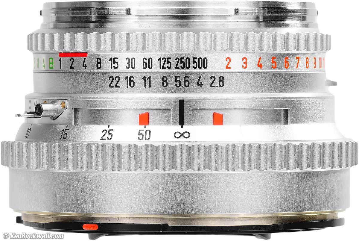 Recommendations topSample Images Intro New Good Bad Missing Compatibility Format Specifications This is the perfect lens for just about everything shot with the HASSELBLAD. Add the 150mm for portraits, and you have almost everything covered. Since the optics of all the versions are the same, you may as well save money and get the oldest and cheapest C model I've shown here, if you have a good way to get it serviced if needed. If not, a CF or CFE version has exactly the same optics, but they're much safer bets if you just want to go shoot without overhauling an ancient shutter. T✻ multicoating is unnecessary with the simple optical formula of this lens, so don't worry about it; the real reason to be concerned about a non-T✻ lens is that it's so old you're more likely to need an overhaul. I prefer the C model because it weighs about 2 oz. (57 g) less than the CF and CFE versions. The C version is also the only one with flashbulb (M) sync, and the only one with a built-in self timer to save me from needing a cable release. Expect that whatever you get used at eBay may need an overhaul to get all the shutter speeds accurate again. (I got mine at eBay; see How to Win at eBay). I had Gus service mine, but he's very backed up. A newer CF version is more likely to work perfectly right out of the box. Get this C version if your other lenses are C, taking B50, filters, and get a CF or CFE version if your other lenses take B60, as opposed to B50, filters. See Assembling a System. Don't bother adapting this to smaller format cameras. A Nikon AI-s 85mm f/2 is a stop faster and smaller, lighter and less expensive for use on 35mm or "full frame" cameras. The PLANAR is the world standard for sharpness, but that's when you use the entire 6×6 cm film gate. Millimeter for millimeter on film it's no better than a Nikon manual-focus 85mm lens. For a front cap, a common 55mm snap-in cap works well if you don't have a real HASSELBLAD bayonet or slip-over cap. I got mine at this link directly to them at eBay. Never buy at a retail store or other dealers; you'll pay way too much and have very limited options if you don't like it. This all-content, junk-free website's biggest source of support is when you use those or any of these links to my personally-approved sources when you get anything, regardless of the country in which you live. Use only the approved sources I use myself for the best prices, service, return policies and selection. Thanks for helping me help you! Ken.