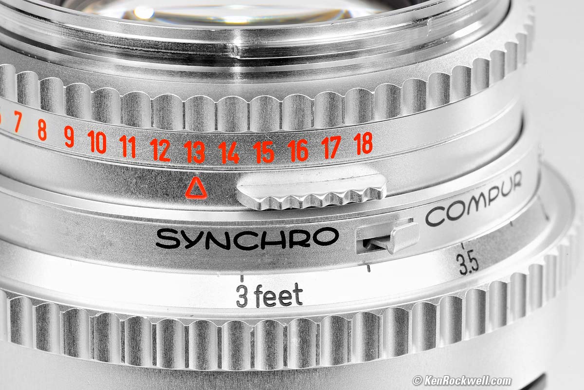 Depth of Field user's guide topTo preview the depth of field, press-in the little lever between SYNCHRO and COMPUR shown above. If your lens is cocked, the diaphragm will stop down, and change as you set apertures. To reset it to stay open, either take the picture, or set the lens to f/2.8, at which point the diaphragm will now stay locked wide-open as you set different apertures. This C version has an automatic analog computer that calculates the depth of field for a 60 micron circle-of-confusion. This is always displayed by the red bars next to the focus scale. Newer models economized and removed the computer; they have the usual markings. To calculate the aperture that will give optimum sharpness when you need depth-of-field and don't want diffraction to soften the image, put a new scale over the computer display and use these half distances (see here for details of how to use these): focal length = 80.5 mm (actual design focal length)