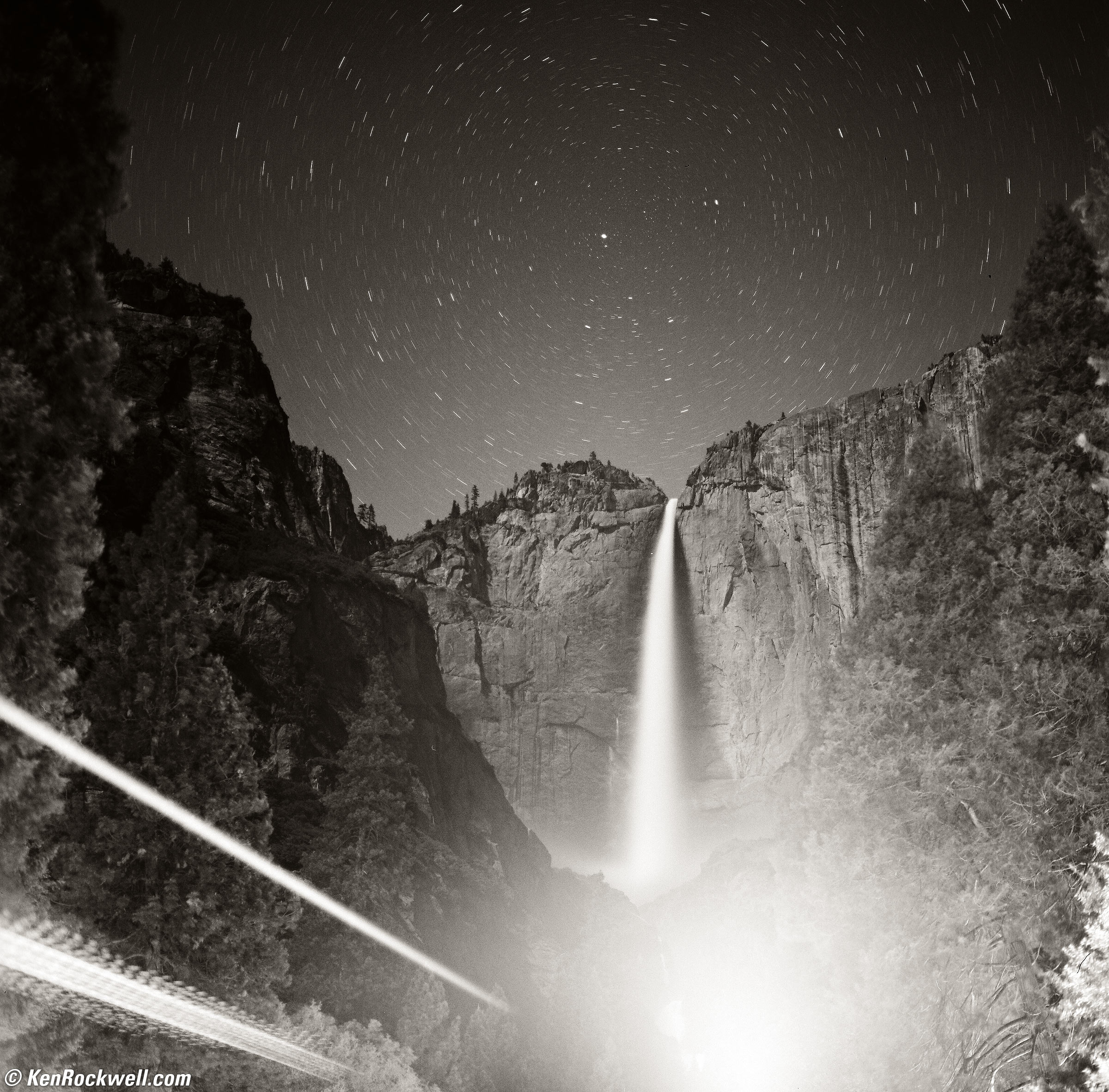 Yosemite Falls by Moonlight (first quarter) with Star Trails, Yosemite National Park, 9:32 ~ 9:40 PM, Friday, 13 May 2016. HASSELBLAD 500C/M, ZEISS PLANAR T✻ 80mm f/2.8 CF, no filter, f/2.8 for eight minutes on Fuji ACROS 100, Great American Photo Lab develop & scan, Radiant Photo software, split-toned print. Gossen Luna Pro SBC read LV -5 (minus five). Photo: Ken Rockwell. bigger. What look like light leaks are passing busses on the bottom left and approaching cars at the bottom center. While the trees are blowing in the wind (or growing) in the course of this 8-minute time exposure and therefore soft, look carefully at the star trails in the upper corners and you'll see how sharp they are, even wide-open at f/2.8.