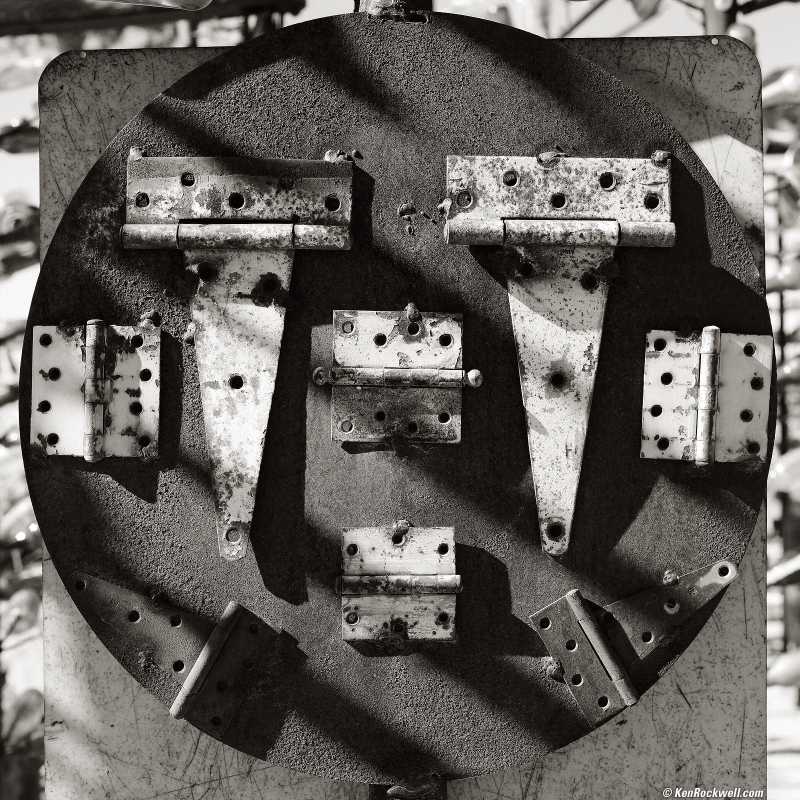 Metal Sculpture at the Bottle Tree House, Route 66, 10:49 A.M.1993 Zeiss Planar T✻ 80mm f/2.8 CF with Heliopan B60 Yellow filter, 1.19 meter focus distance,1992 Hasselblad 503 CX with 1985 PME metered prism reading EV 11/12, Kodak T-Max 100 in 1993 A12 magazine, f/9.5 at 1/30. (My Gossen Luna Pro SBC and iPhone light meter app both agree at EI 50.) bigger.