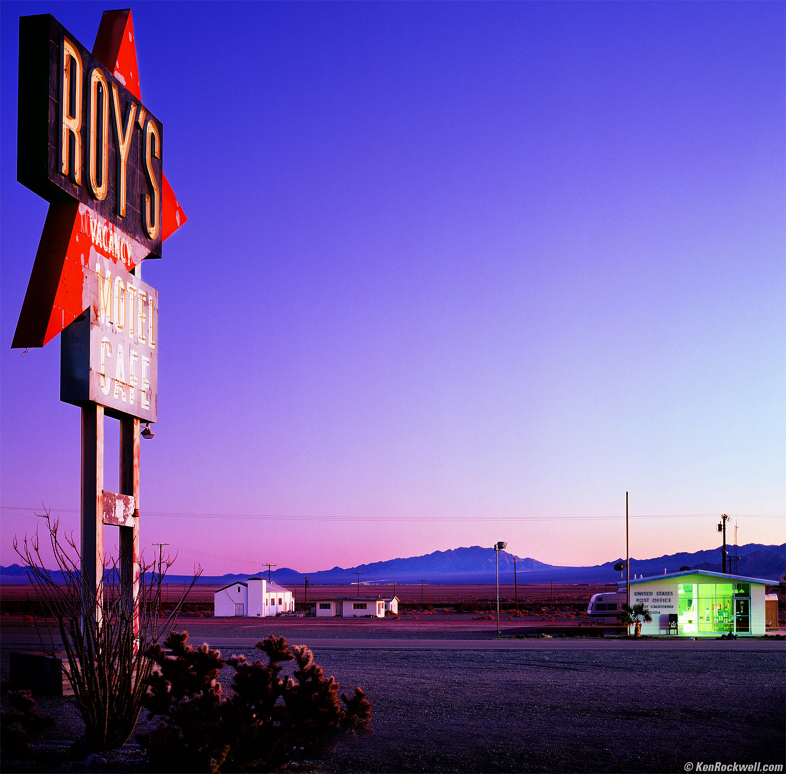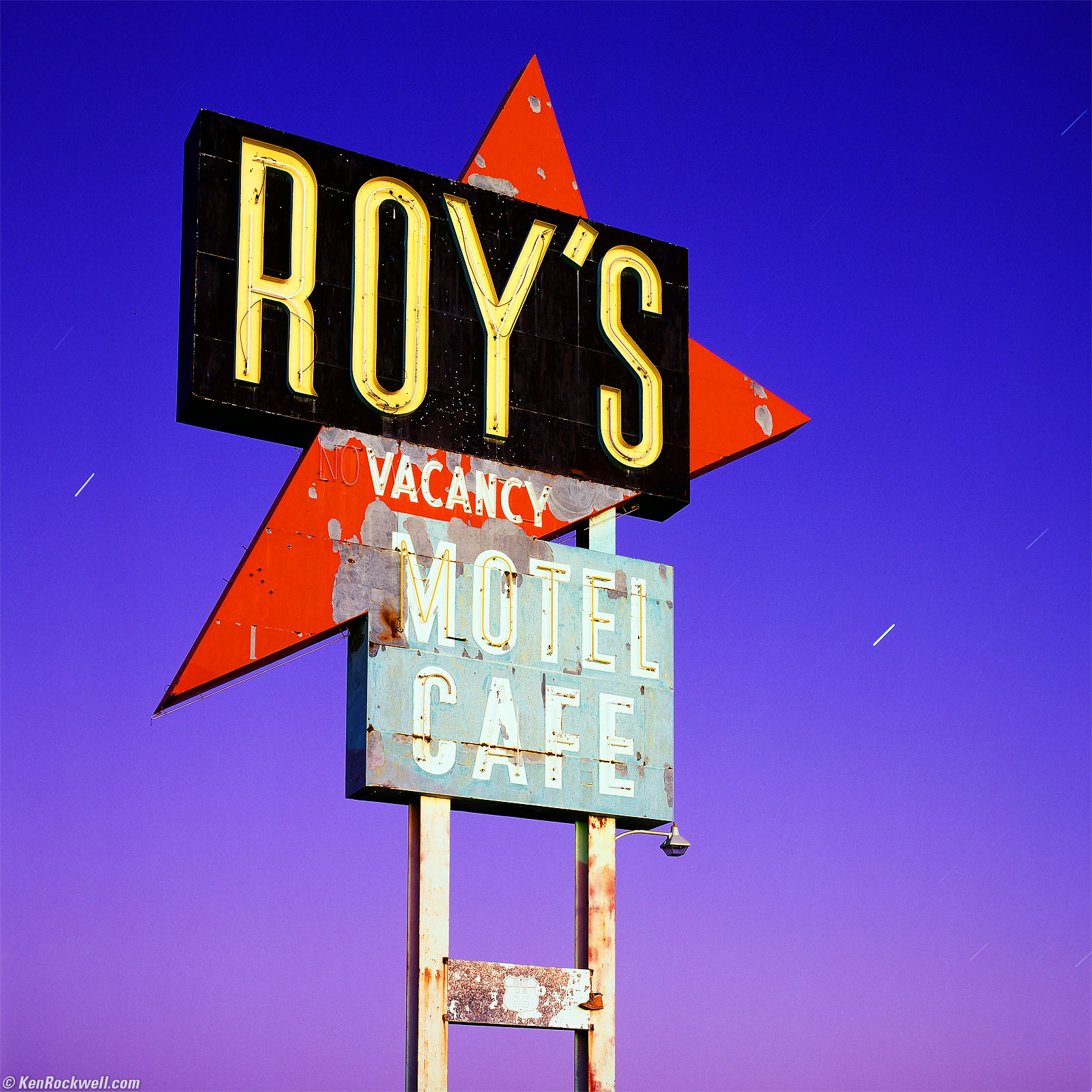 Roy's Sign by Starlight, Route 66, 5:22 ~ 5:55 P.M. 1993 Zeiss Planar T✻ 80mm f/2.8 CF with Hasselblad B60 CR 1,5 warming filter, 50 foot focus distance, 1992 Hasselblad 503 CX with 1985 PME metered prism, Fuji Velvia in 1996 Hasselblad E24 magazine, f/5.6 at 3 minutes and 33 seconds. bigger.