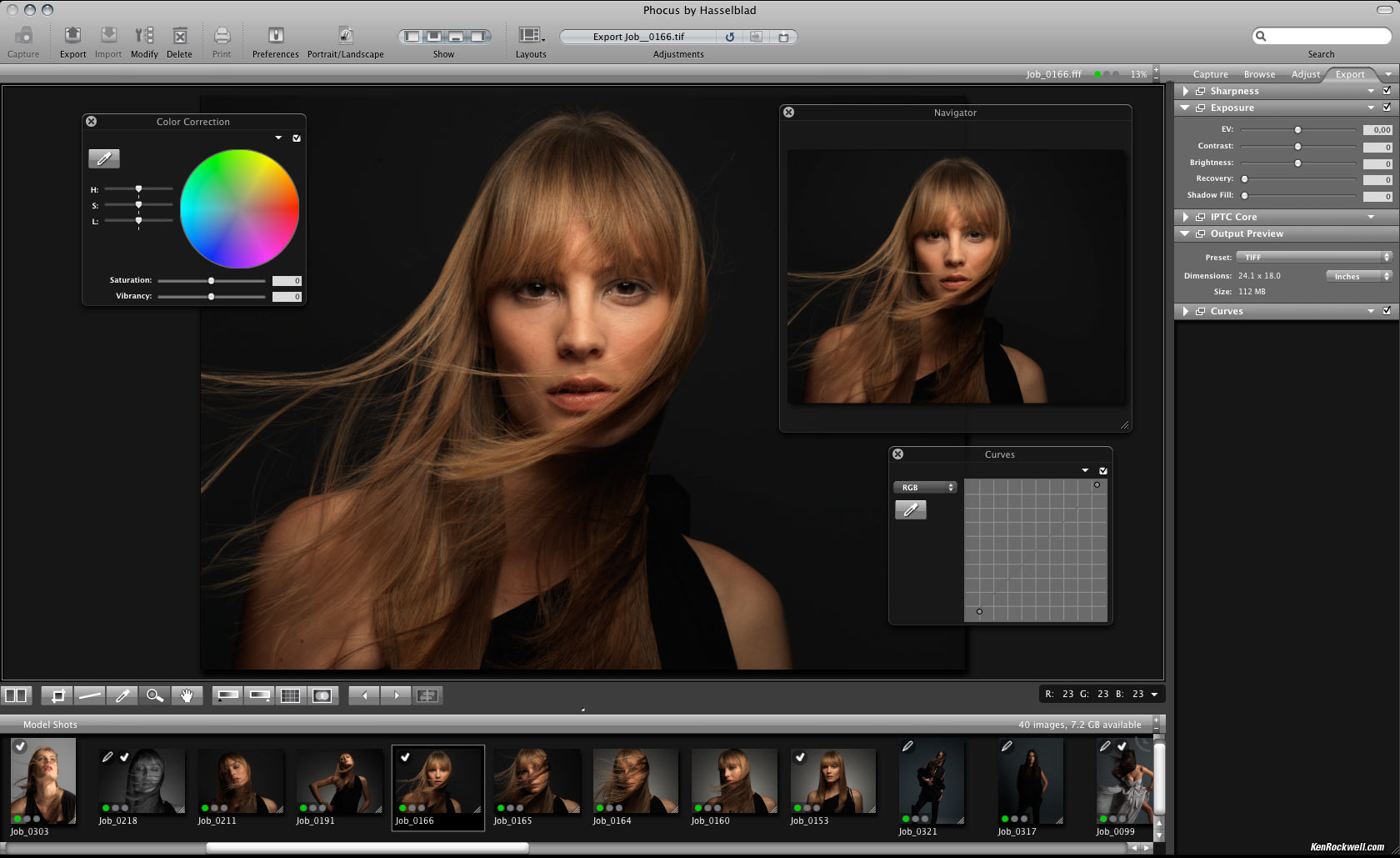 Phocus 2.0 sophtware Screenshot. enlarge. The H4D comes with new Phocus 2.0 sophtware included. Hasselblad claims that you'll waste an average of 15 minutes trying to learn it, and that it does pretty much what you already can do in Aperture, Lightroom or Capture One. I don't know if Hasselblad's claims for how long it takes to figure out are how long it takes us on our own, or with a Hasselblad trainer showing us in person. The sophtware corrects HC/HCD lenses distortion, vignetting and chromatic aberrations.