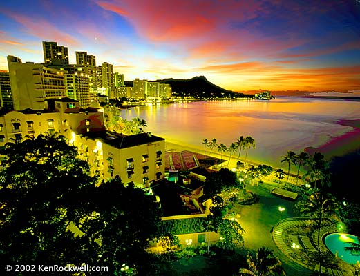 I made this shot about 20 minutes before sunrise. Everyone else was still asleep. Notice the brightness of the lights in the other hotels. It was dark out and our eyes don't see the colors as brilliantly as the film did. The colors are this intense for only a few minutes. The rest of the roll before and after was boring. To get these colors you have to be up and shooting while everyone is asleep in the morning, and shoot while everyone else is eating or getting ready for dinner in the evening.