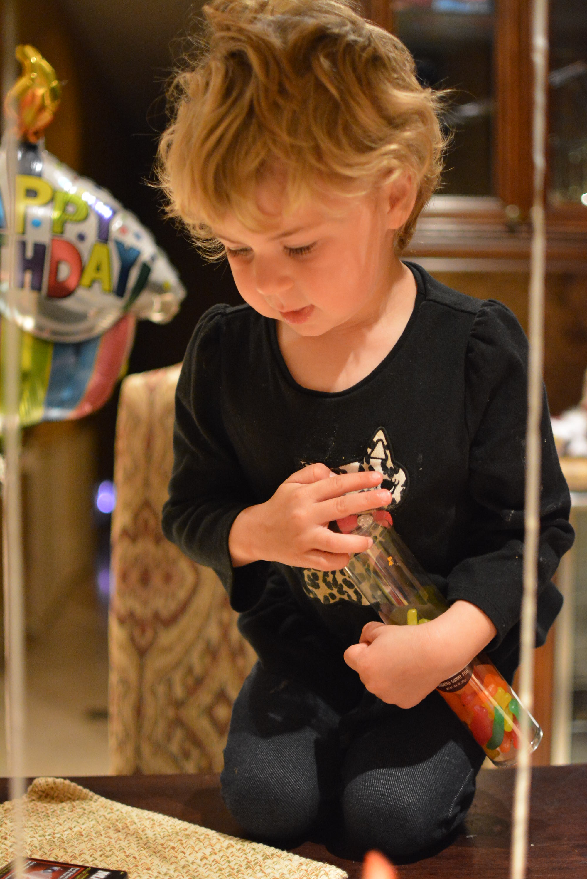 Katie made Daddy a birthday present. Mama marked it "Do not open!!" (Nikon D5200, Nikon 35mm f/1.8 DX, Auto ISO 500, f/1.8 at 1/125, Athentech Perfectly Clear plug-in.)