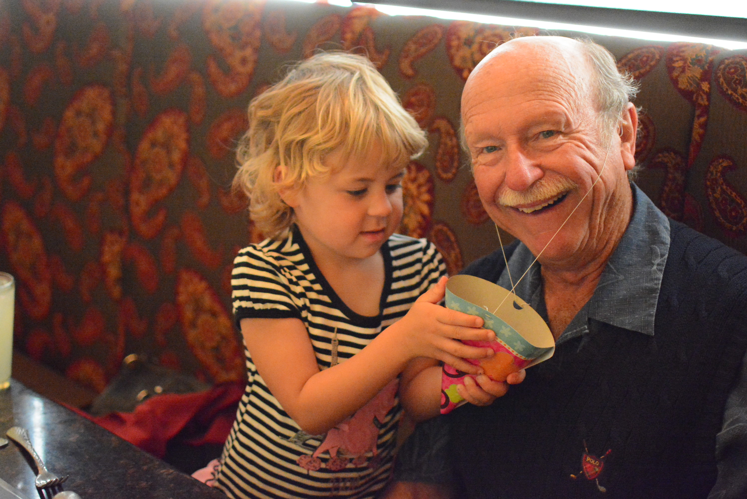 Katie puts a birthday hat on Pops. (cropped from horizontal, focus on Pops, Katie out-of-focus, Nikon D7100, Nikon 35mm f/1.8 DX, AUTO ISO 10,000, f/1.8 at 1/125, AUTO white balance with A2 adjustment, STANDARD Picture Control with +1 Saturation and 7 Sharpening, Athentech Perfectly Clear plug-in.) © Camera-Original BASIC SMALL JPG.