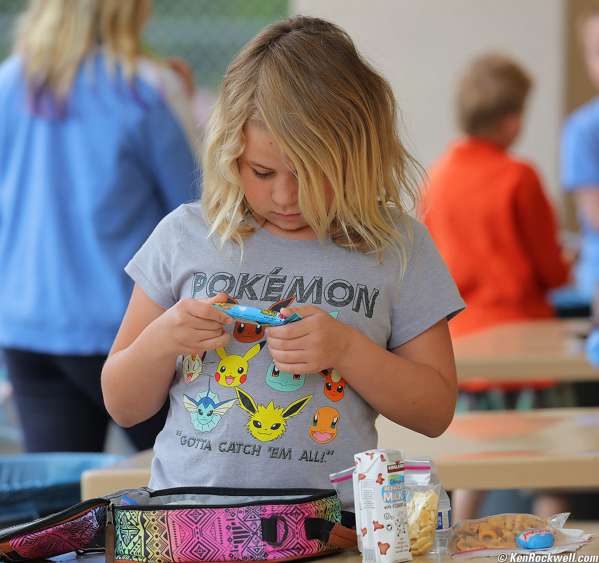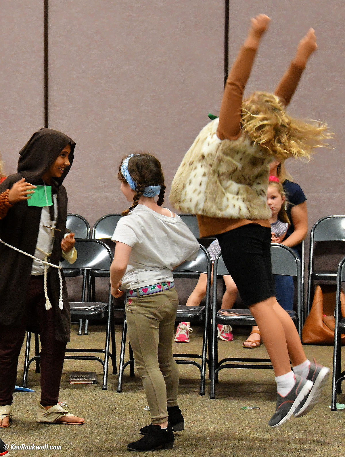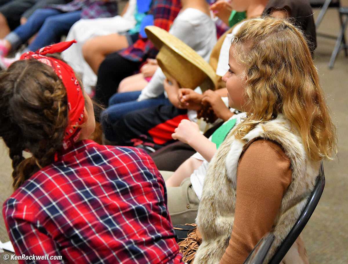 Katie sitting with her class. Katie is wearing a quickly thrown together American Indian costume. (Nikon D850, Nikon 28-300mm VR at 100mm at f/5.3 at 1/125 at Auto ISO 8,000, Perfectly Clear.) bigger.