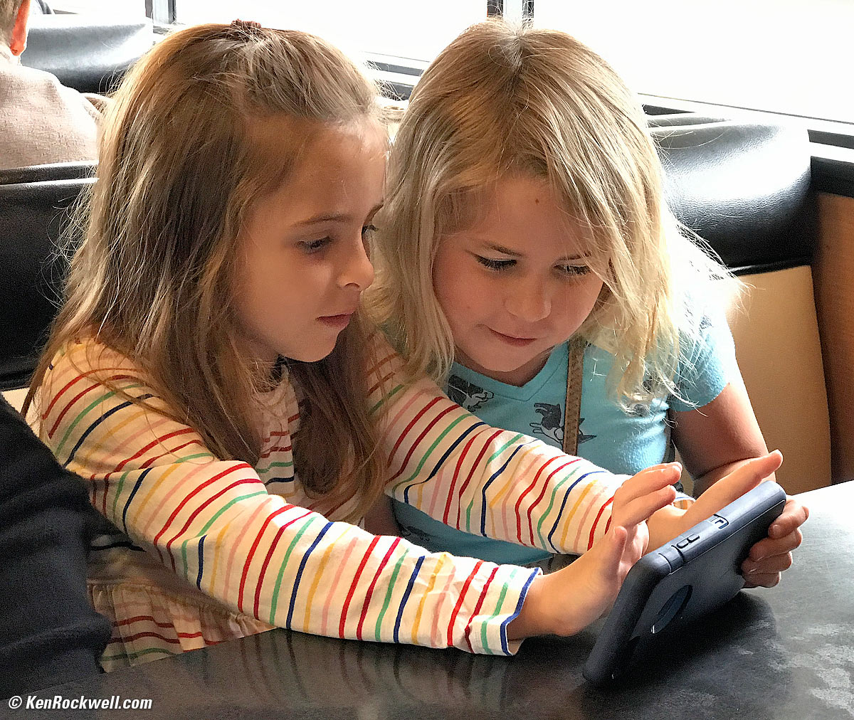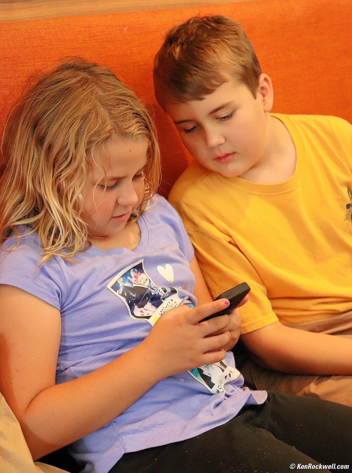 Ryan and Katie play on Katie's iPhone 5. Canon SL2, Canon 18-55mm f/4-5.6 STM IS at 44mm at f/5 at 1/60 at Auto ISO 4,000, Perfectly Clear. bigger.