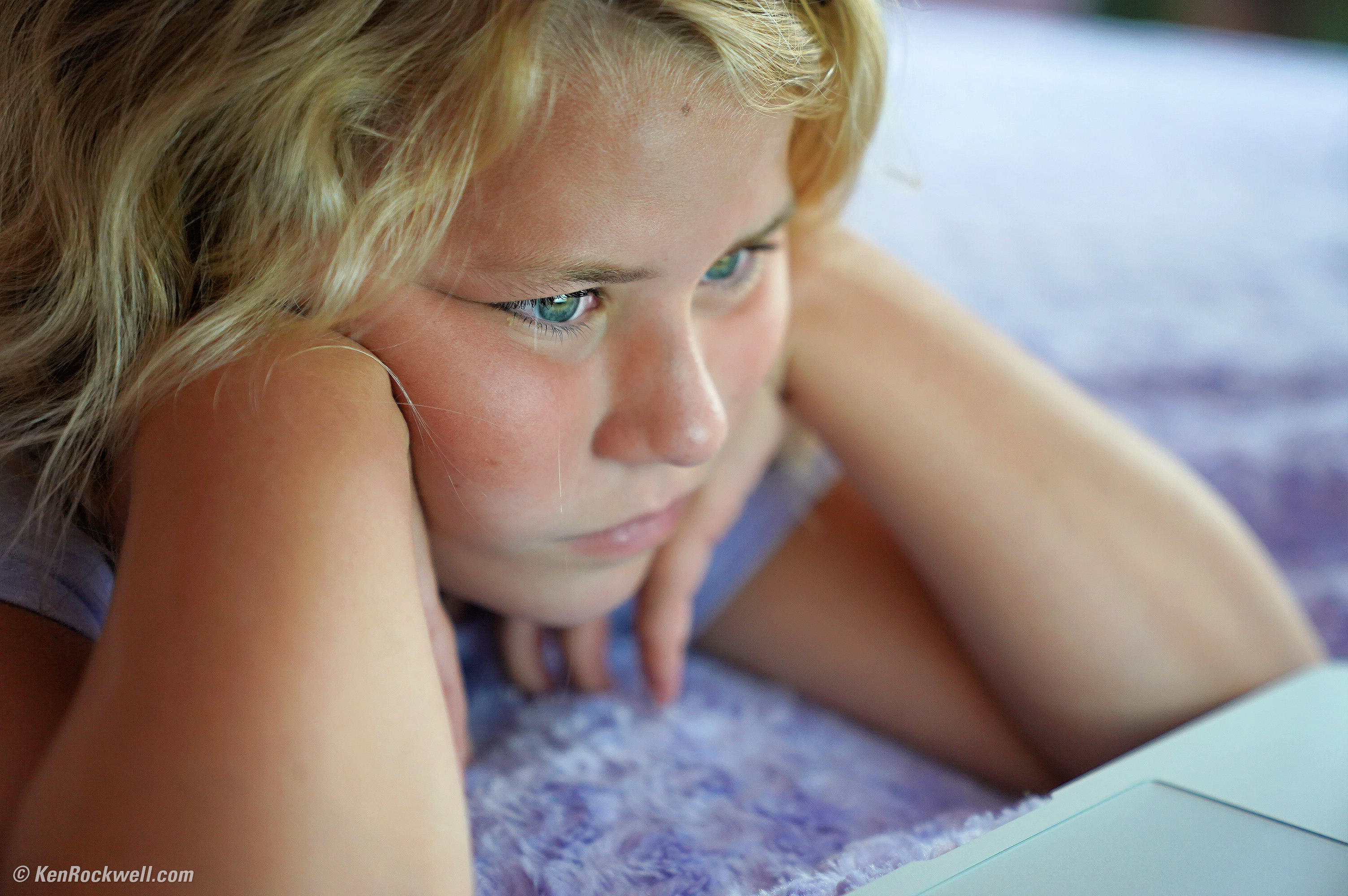 Katie watches her MacBook Air. Sony A9, Sony 24-70/2.8 GM at 69mm, f/2.8 at 1/125 at Auto ISO 2,000. bigger or full-resolution file.