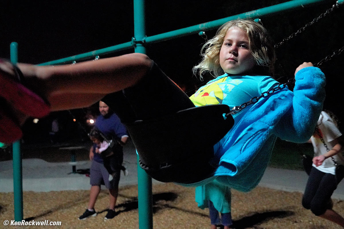 Katie swinging at 9 o'clock at night. Sony A9, Sony 24-240mm at 46mm wide-open at f/4.5 at 1/160 at Auto ISO 25,600, Perfectly Clear. bigger.