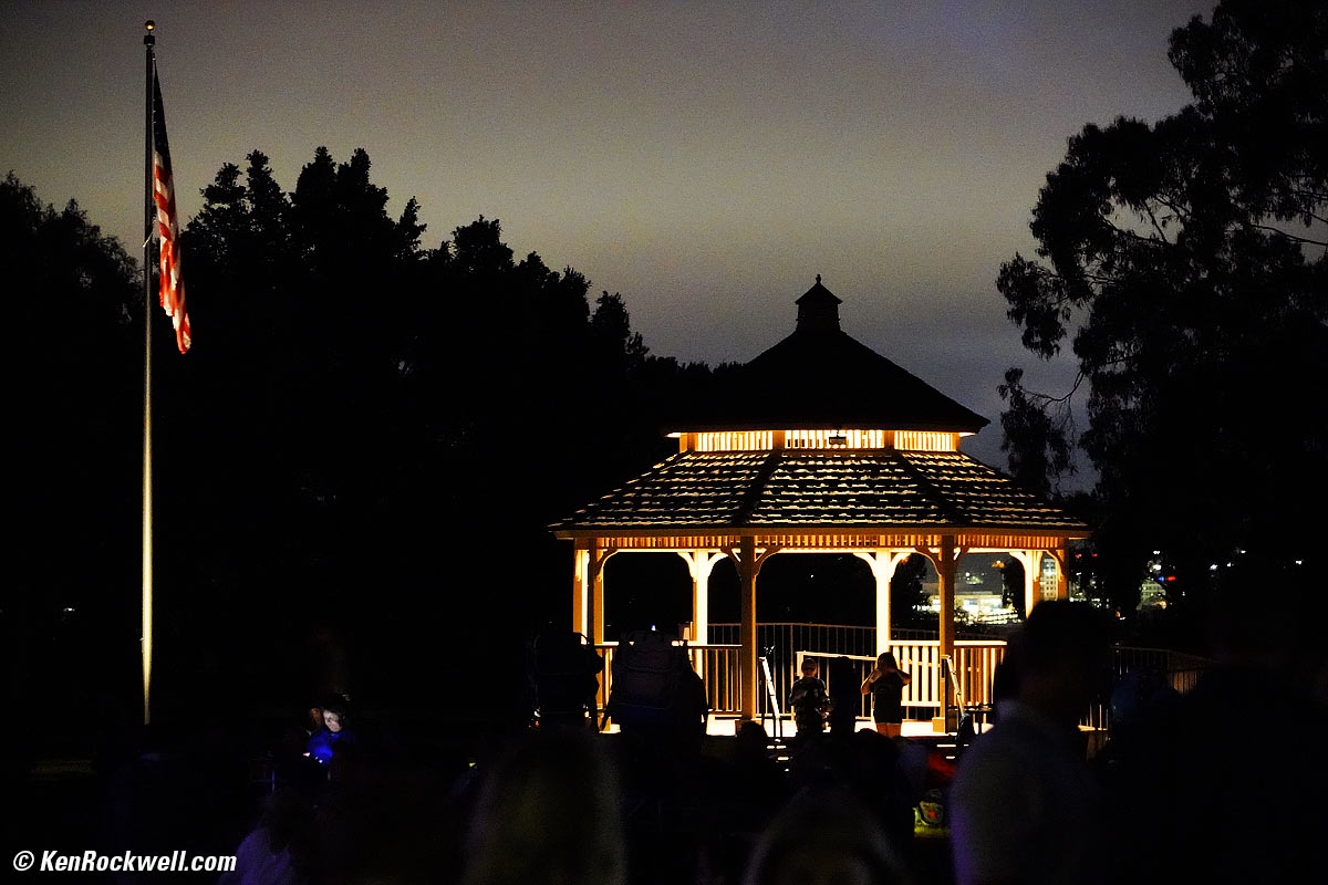 Gazebo at night. Sony A9, Sony 24-240mm at 157mm wide-open at f/6.3 hand-held at 1/8 at Auto ISO 25,600, Perfectly Clear. bigger.