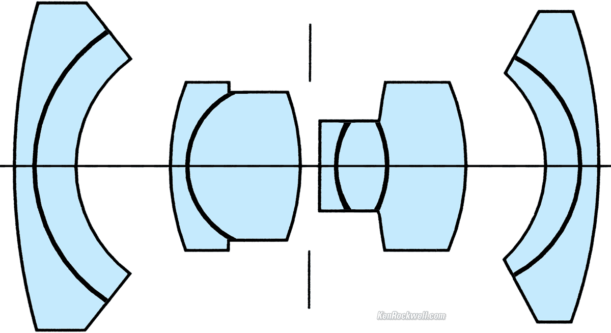 Optics top Cross-section. Vergrößern. 9 elements in 4 groups. Classic SUPER-ANGULON symmetrical design, but even more complex than the f/5.6 and f/8 view-camera versions. Single-coated mostly in blue.