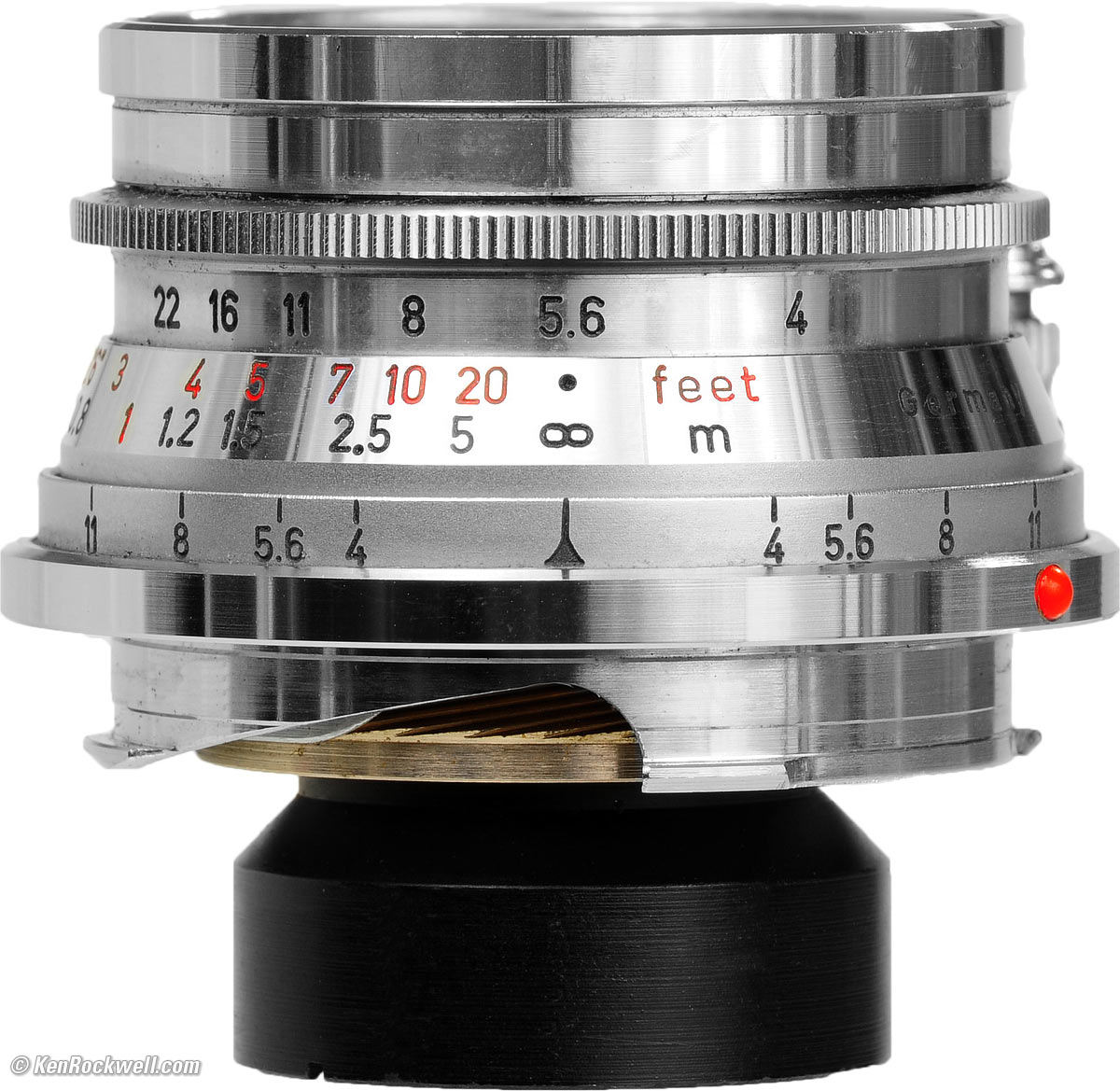 Aperture Setting top Setting apertures is a bear for two reasons. First, you can't see the numbers in anything other than diffuse light because of the shiny chrome finish. The photo above is made in diffuse studio light, and it's still hard to see. Forget it in direct sunlight; you have to shield the lens in your own shadow to read it. The chrome isn't matte chrome, it's shiny like a bumper. Second, the aperture ring, aperture scale and index dot rotate with the lens as it focuses. As shown above, set to infinity, the aperture index dot is where you expect it, but focused to 2 feet, the index is rotated 90º to the right. There is a duplicate scale 180º on the other side of the lens. When focused at 16" (0.4m), it's at the top of the lens. It's not that bad once you get used to looking for it, but compared to Leica's other modern lenses, this is more difficult. The aperture ring has full-stop clicks. It rotates in the opposite direction from most other Leica lenses. Apertures are not evenly spaced, but they're close enough. I certainly prefer the 9-bladed diaphragm and funny aperture ring over the bogus 4-bladed diaphragm of the SUPER-ANGULON 21mm f/3.4 (1963-1980) and 8-bladed diaphragm of today's ELMARIT-M 21mm f/2.8 ASPH.