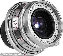 Home Donate New Search Gallery How-To Books Links Workshops About Contact LEICA 21mm f/4 Intro Specs Performance Compared Recommendations LEICA SUPER-ANGULON 21mm f/4, twice actual size (39mm filters, 8.8 oz./251g, about $1,000 used). Vergrößern. You can get them at this link to them at eBay (how to win at eBay), you also can get them from Adorama. It helps me keep reviewing these oldies when you get yours through these, links, thanks! Ken.