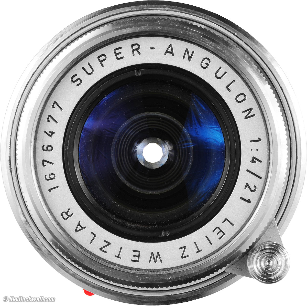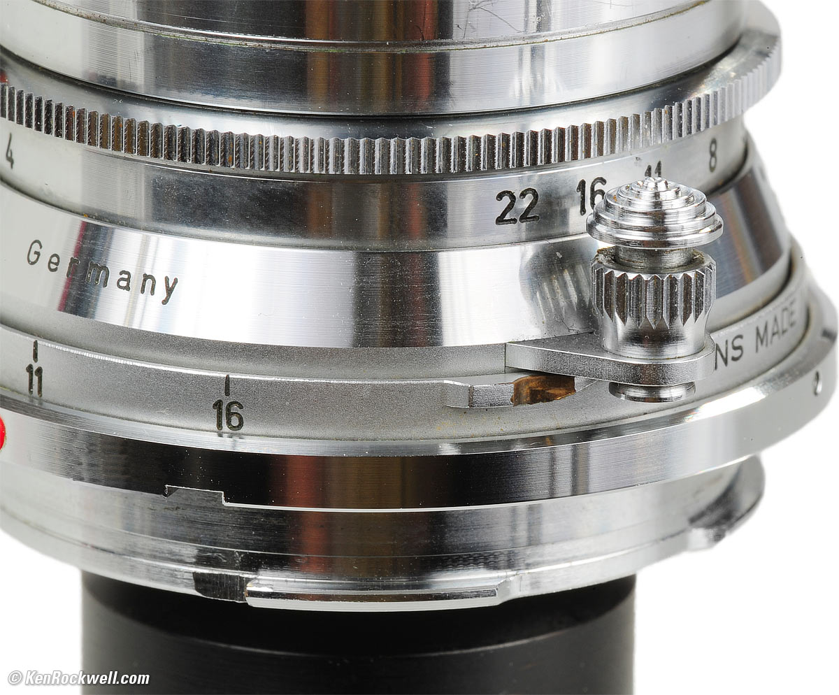 Focus Focus button, LEITZ SUPER-ANGULON 21mm f/4. Vergrößern. Focus is with a little button on the bottom of the lens. It locks at infinity to help mounting and unmounting; press it towards the camera to unlock. One-quarter turn (90º) brings you from infinity to 0.7 meters. It focuses to 0.4 meters. The entire lens rotates as a unit, except for the bayonet mount. The front filter thread, the aperture ring, the focus ring and the back of the lens all turn together. The distance scale is shiny chrome, so it's impossible to read in direct sunlight. Read it your body's shadow outdoors.