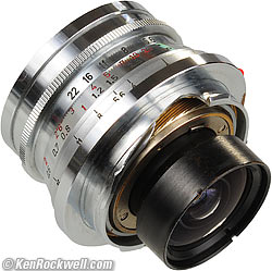 This LEITZ SUPER-ANGULON 21mm f/4 is the smallest and lightest 21mm lens ever sold by Leica. It's the size of a golf ball, but because it's solid brass, weighs as much as a larger lens (8.8 oz. or 251g). This tiny lens is unique, and my favorite, because in addition to its high optical performance, it's the only Leica 21mm lens that takes standard 39mm filters and front caps. Therefore you need not trouble yourself carrying a second set of 48mm, 55mm or 60mm filters and caps just for the 21mm lens, as newer 21mm lenses expect. This SUPER-ANGULON 21mm f/4 is also the first 21mm lens ever sold by Leica. It actually was made by Schneider, and resold by Leica. The LEICA 21mm f/4 is an exquisite jewel of a tiny lens, with a magnificent 9-bladed diaphragm and complex 9-element design. Its performance is excellent. Unlike newer lenses, it has no visible distortion, and it is sharp edge-to-edge. Corner falloff of illumination is as to be expected from a symmetrical ultrawide lens, which means that it's great to be used for its artistic effect and saves you from extra edge-burning. Falloff looks great; it's a smooth fall-away from center which gives punch, like this: Jesus of Barstow. More glorious. Photographed with Fuji Velvia 50, B+W MRC 39mm 81A filter, 1963 LEICA M3, 1980 LEICAMETER MR-4 CdS light meter, NCPS scan. I used the moderate falloff to emphasize Jesus' impromptu halo. What's funny is how so many online experts chastise this lens as having too much falloff, not realizing that this is what all ultrawide lenses designed for rangefinder and view cameras do. This 1950s f/4 lens has the same falloff as today's LEICA ELMARIT-M 21mm f/2.8 ASPH! Online experts aren't photographers. The only disadvantage to this lens is that its shiny, not matte, chrome finish makes it very difficult to see settings in daylight. It's like trying to look at a chrome bumper. I use the shade of my body to read settings if I'm in direct sunlight. The SUPER-ANGULON's unique combination of excellent image quality, small size and weight, 9-bladed diaphragm, super close-focus and great system integration by taking the same filters and caps as everything else makes it my favorite. You won't get TTL metering, and otherwise, I love it.